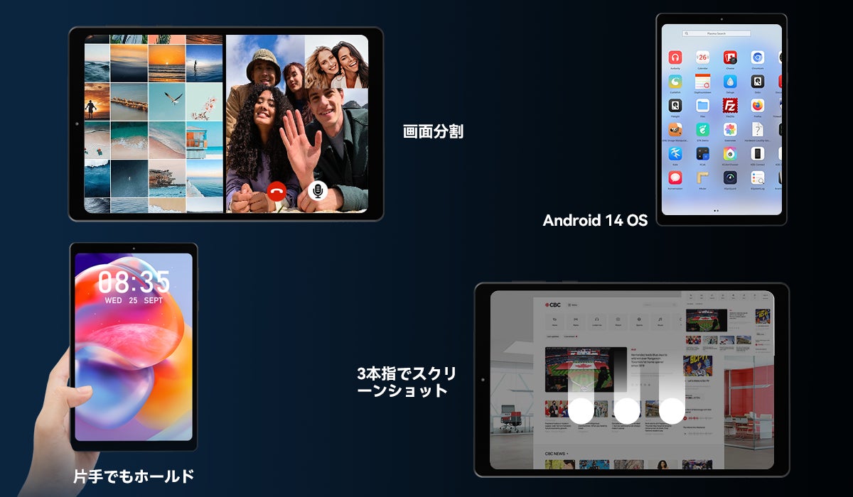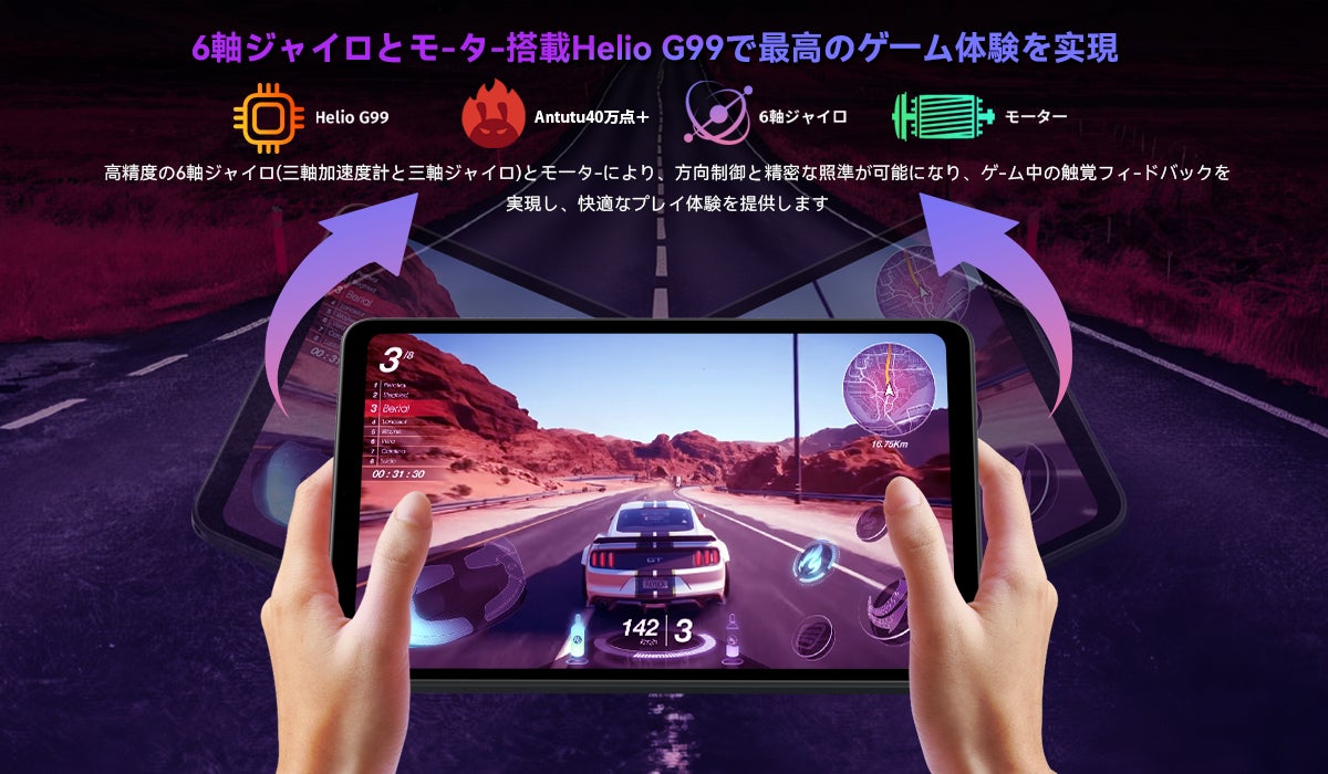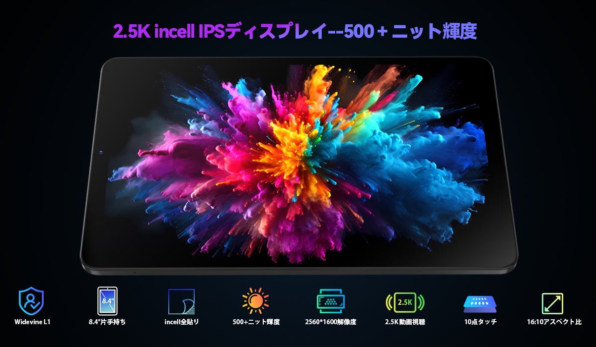 8.4インチ│2650*1600高解像度│6500mAh│16GB(8GB+仮想8GB拡張)+256GB│ Helio G99│4G LTE│2.4/5G WiFi│Android14│6軸ジャイロ│顔認識│Widevine L1対応│GPS