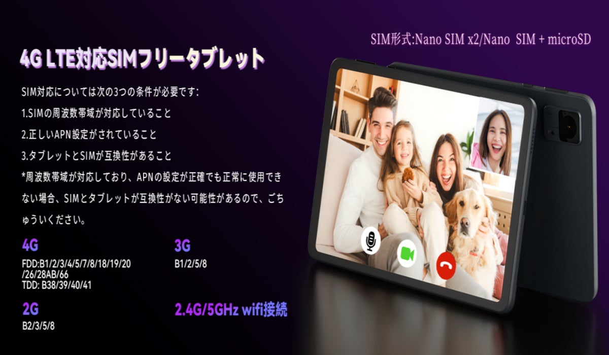Alphawolf APad2は4G LTE通信・SIMフリー対応しており、SMSを送信したり電話をかけたりできます。外出中・WiFiがないところでも楽にインターネット接続できます。