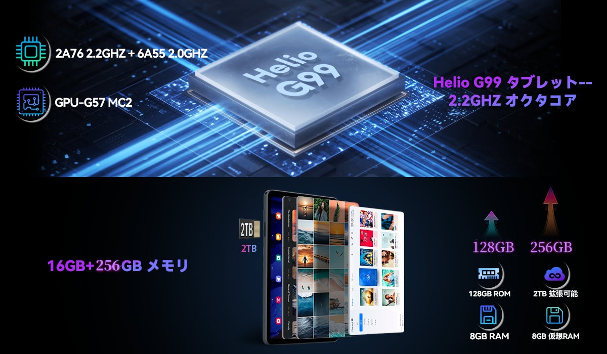 進化点③Alphawolf APad2には16GB(8GB+仮想8GB拡張)の大容量メモリを備えており、複数のアプリケーションやタスクを同時に処理しても快適に動作します。内蔵ストレージは256GBの大容量で、最大2TBまでのマイクロSDカードの拡張可能なストレージにより、写真/映画/音楽鑑賞/オンライン授業/ビデオ会議/事務作業などをストレスなくお楽しみいただけます。それに、Helio G99プロセッサーを搭載し、8コア設計により優れた処理能力と低消費電力を実現します。