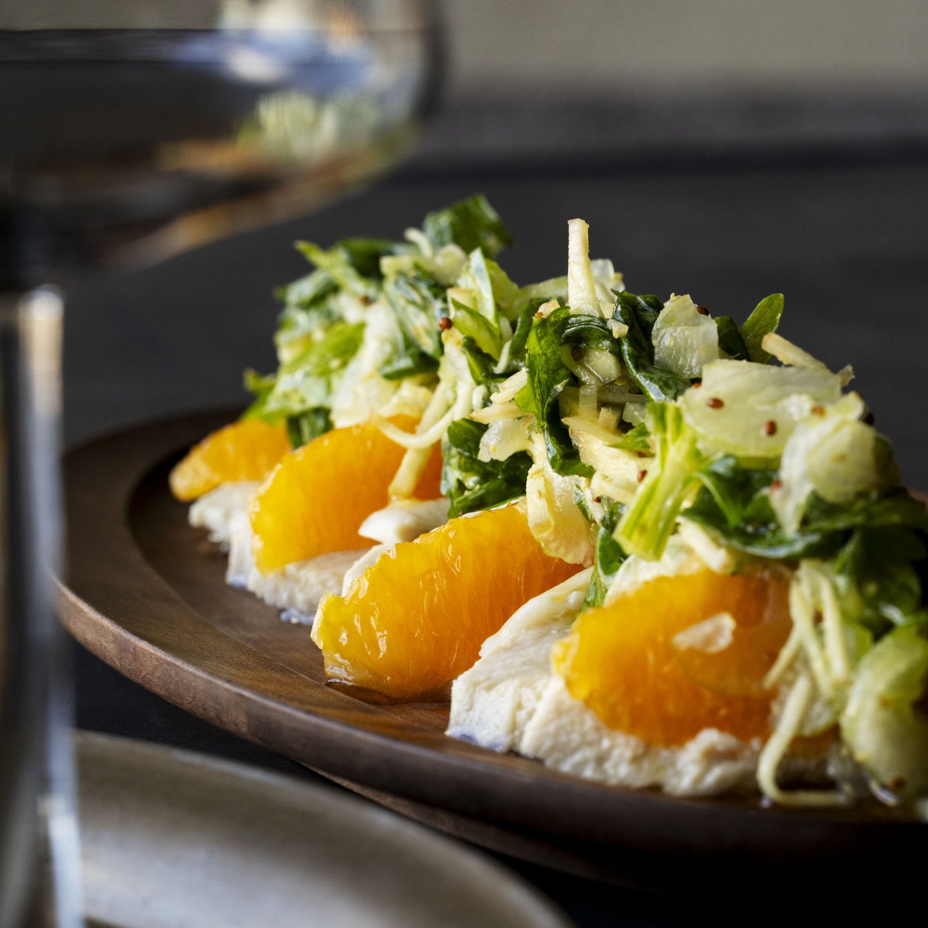 サラダチキンとオレンジ薬味のせ/くるみとにんじん、オレンジのサラダ/オリーブとツナのりんごカナッペ/ぶどうと生ハムのアペロ など