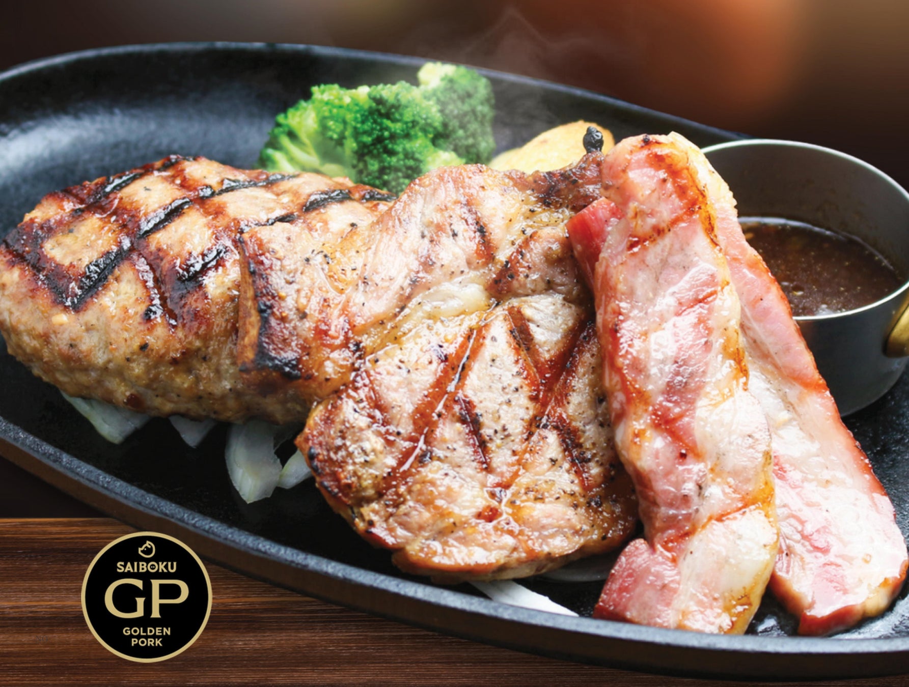 サイボクのブランド豚「ゴールデンポーク」の肩ロースステーキと、保存料を一切使用せず、熟練の技で丁寧に作り上げたベーコン。ハンバーグ工房の三ツ星ハンバーグのMIXグリル