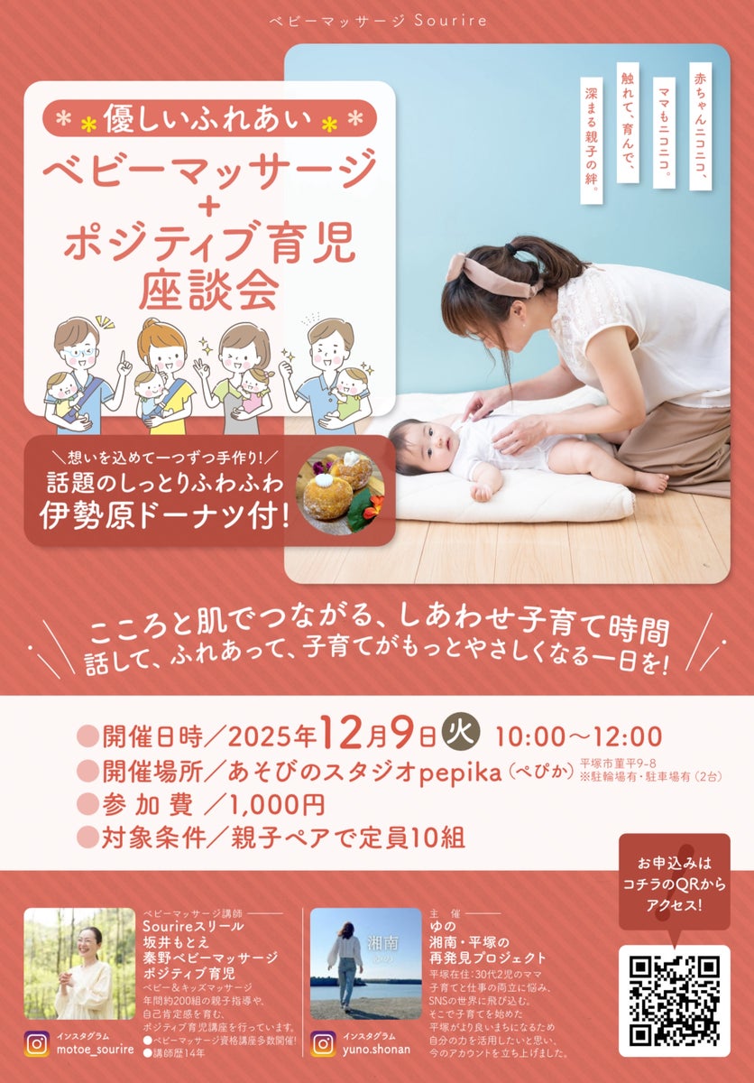 湘南・西湘エリアで地域密着型のまちづくりを進める株式会社マッケンジーハウス(本社:神奈川県平塚市)は、2025年12月9日(火)に、平塚市の「あそびのスタジオ pepika」にて、ベビーマッサージ教室を主催する。
