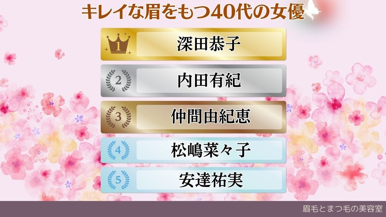 美しい眉をもつ40代の女優をお聞きしたところ「1位>深田恭子」、「2位>内田有紀」、「3位>仲間由紀恵」、「4位>松嶋菜々子」、「5位>安達祐実」という結果になりました。