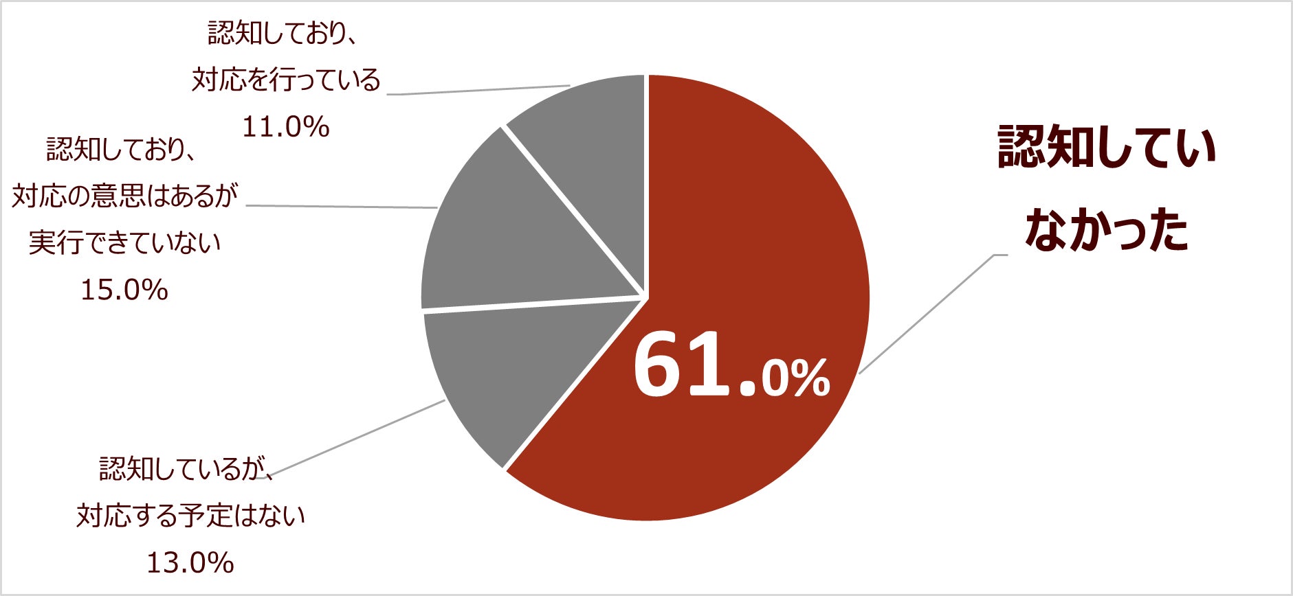 「2025年の崖」に向けた対策状況について尋ねると、全体の6割以上が「認知していなかった」と回答しました。経済産業省が2018年から警鐘を鳴らしている一方で、認知度は依然として低く、多くの企業でデジタル化への取り組みが進んでいない現状が明らかになりました。