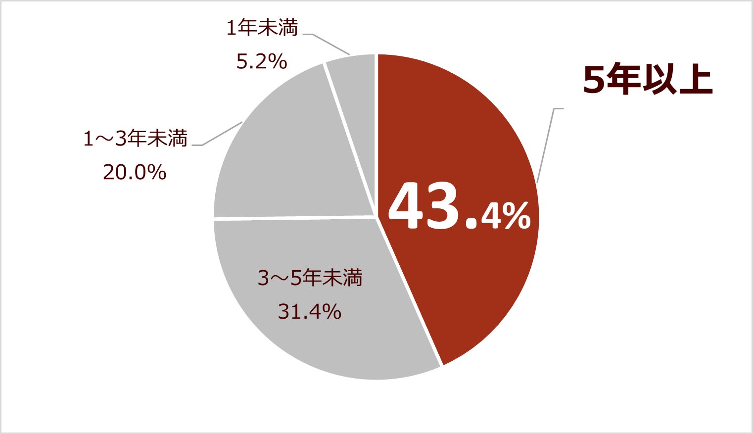 設備保全に関する技術伝承が完了するまでに必要と思われる標準的な期間について調査したところ、「5年以上必要」と回答した人が全体の4割にのぼりました。設備保全分野における技術の伝承が短期間で完了するケースは少なく、長期にわたる継続的な取り組みを必要とすることが分かりました。