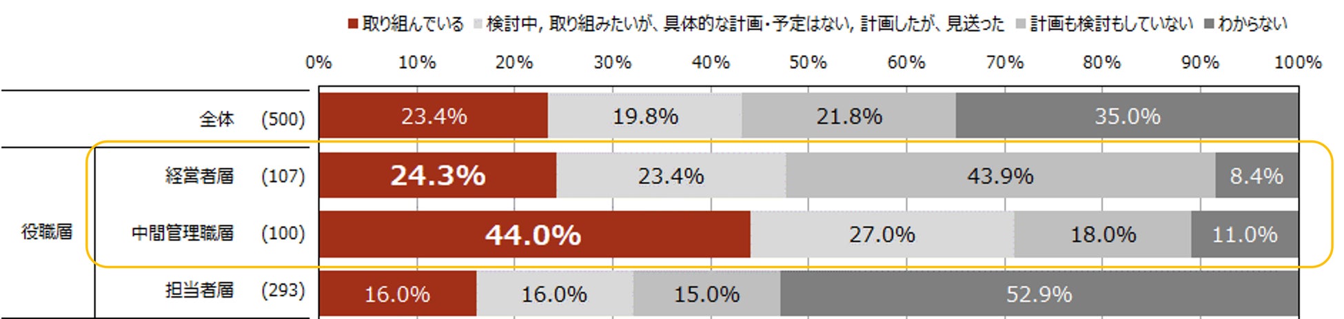 DXの取り組み状況について尋ねたところ、「取り組んでいる」と回答した割合は全体の23.4%にとどまりました。役職別に見ると、中間管理職層では44.0%がDXに取り組んでいると回答した一方、経営層ではわずか24.3%、現場層ではわずか16.0%にとどまりました。また、経営層の4割以上が「計画も検討もしていない」と回答しており、経営視点でのDX推進への消極的な姿勢が浮き彫りになりました。現場のリーダーである中間管理職層がDX推進に一定の取り組みが見られるなか、経営層や現場層がその動きを支える役割を果たせていないギャップが浮き彫りになりました。