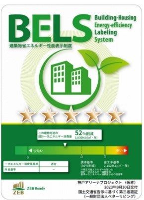 「神⼾から感動と興奮を発信し、世界へ⽻ばたく姿」を表現したV 字型の特徴的な屋根形状は、アリーナの気積を座席形状に合わせて最適化し、空調負荷を低減することにも寄与しています。また全熱交換器の導⼊、CO2 濃度センサーによる外気導⼊量制御等により、基準⼀次エネルギー消費量から約52%の削減を達成し、BELS(建築物省エネルギー性能表⽰制度)認定の最⾼評価(五つ星)を獲得するとともに、⼤規模アリーナ施設(収容⼈数10,000⼈規模)では国内初となる「ZEB Ready」認証を、2023 年9 ⽉30 ⽇付で取得いたしました。
