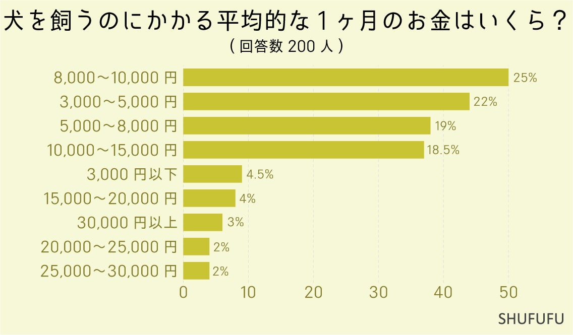 犬を飼うのにかかる平均的な1ヶ月のお金はいくら?(1匹分)に関しては1位「8,000〜10,000円(25%)」、2位「3,000〜5,000円(22%)」、3位「5,000〜8,000円(19%)」、4位「10,000〜15,000円(18.5%)」でした。