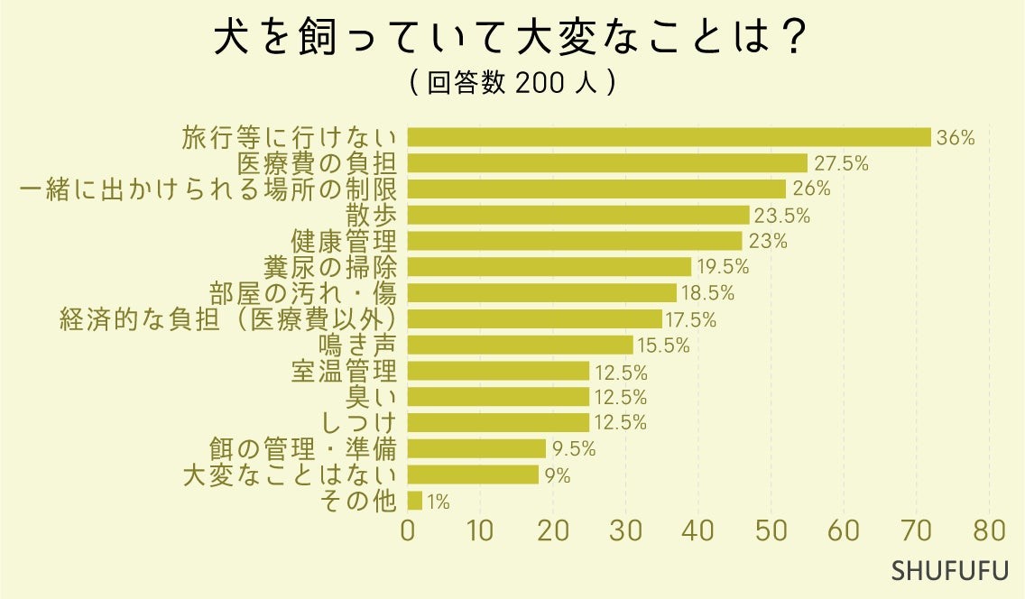 犬を飼っていて大変なことを尋ねたところ、1位は「旅行等に行けない(36%)」、2位「医療費の負担(27.5%)」となりました。
