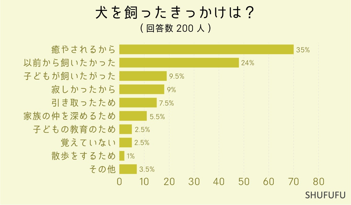 犬を飼ったきっかけでは「癒やされるから」と答える方が1番多かったです。いつも側に可愛い存在がいることは最大の癒しになりますよね。