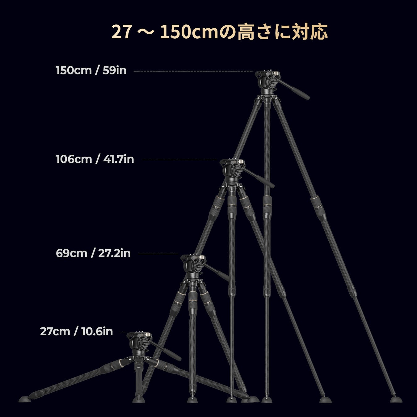 27cm から 150cmまで調整可能で、コンパクトに収納長さがわずか64cmです。