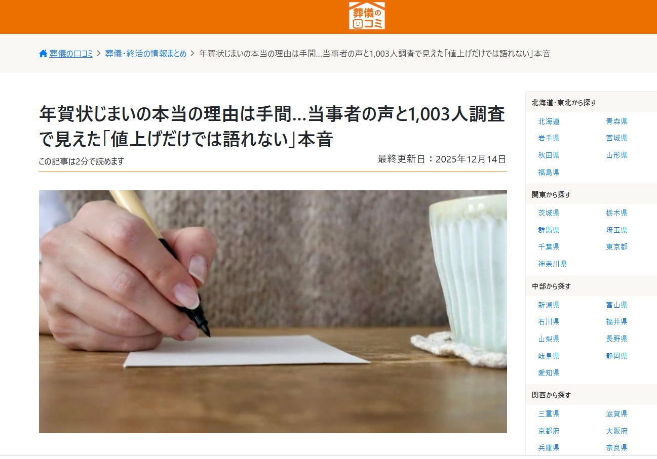 葬儀社の比較サイト「葬儀の口コミ」を運営する株式会社ディライト(本社:東京都新宿区、代表取締役:高橋亮)は、2025年12月14日に年賀状じまいを実際に経験した当事者2名へのインタビュー記事「年賀状じまいの本当の理由は手間…当事者の声と1,003人調査で見えた『値上げだけでは語れない』本音」を公開しました。