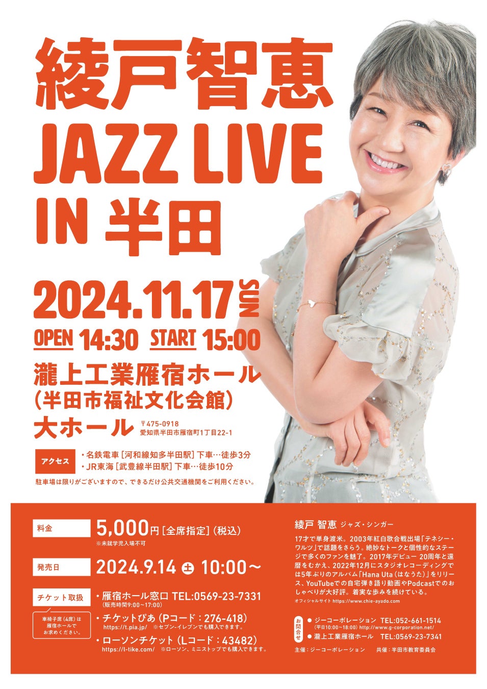 【愛知県半田市】令和6年11月17日(日)『綾戸智恵 JAZZ LIVE IN 半田』を開催します!〈瀧上工業雁宿ホール〉