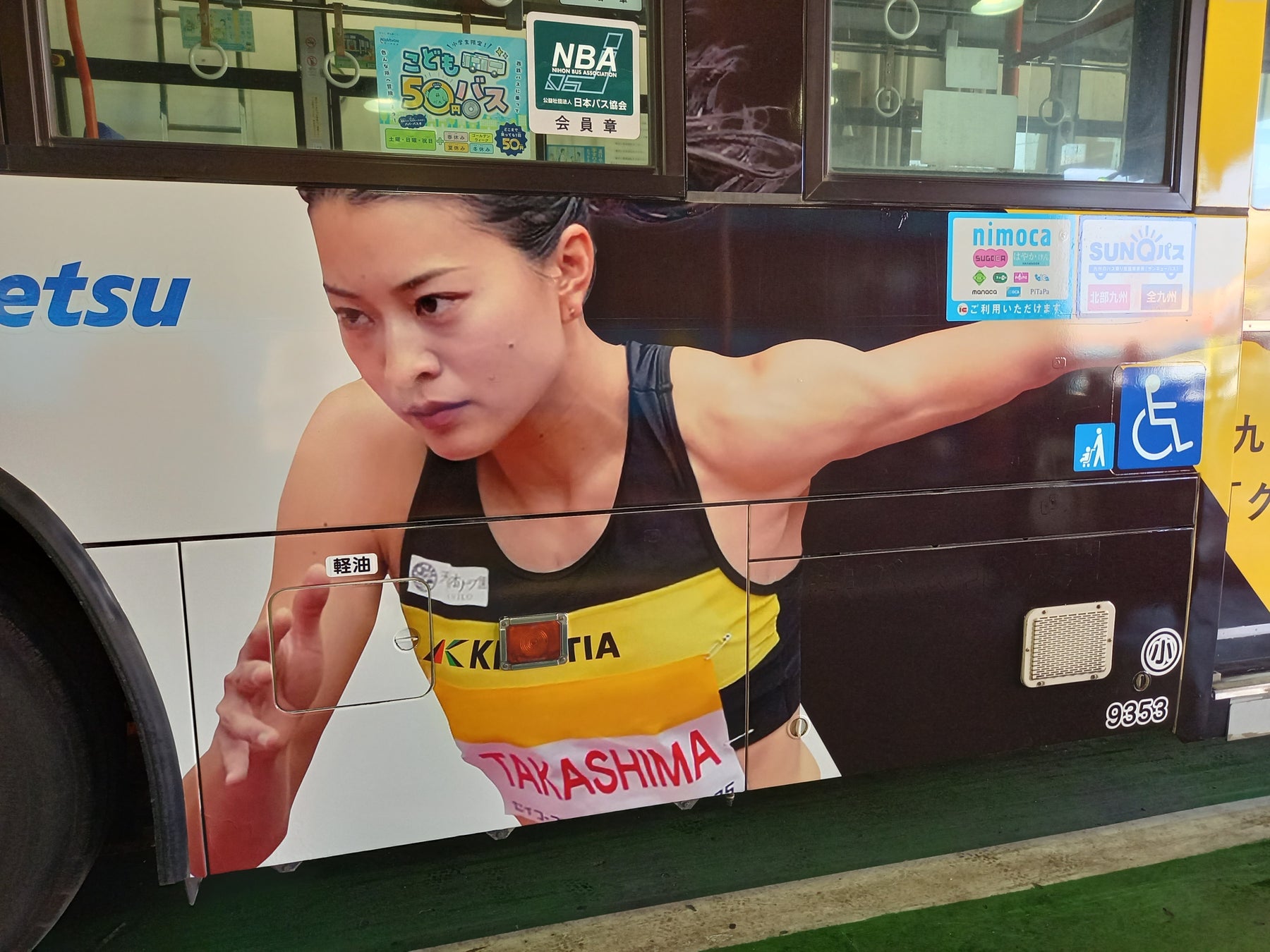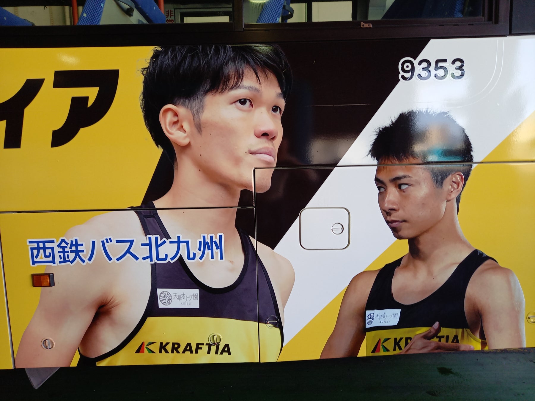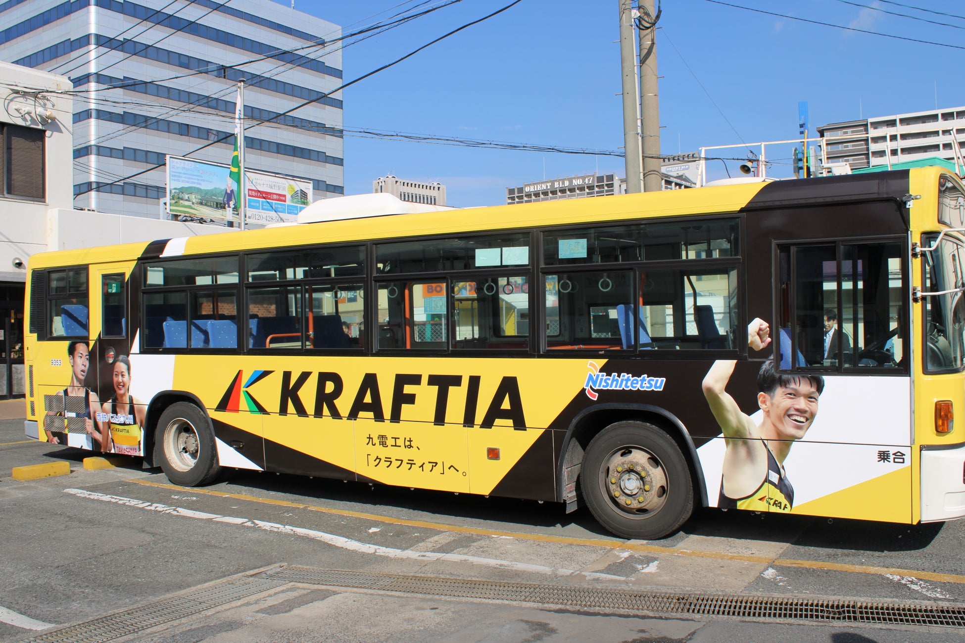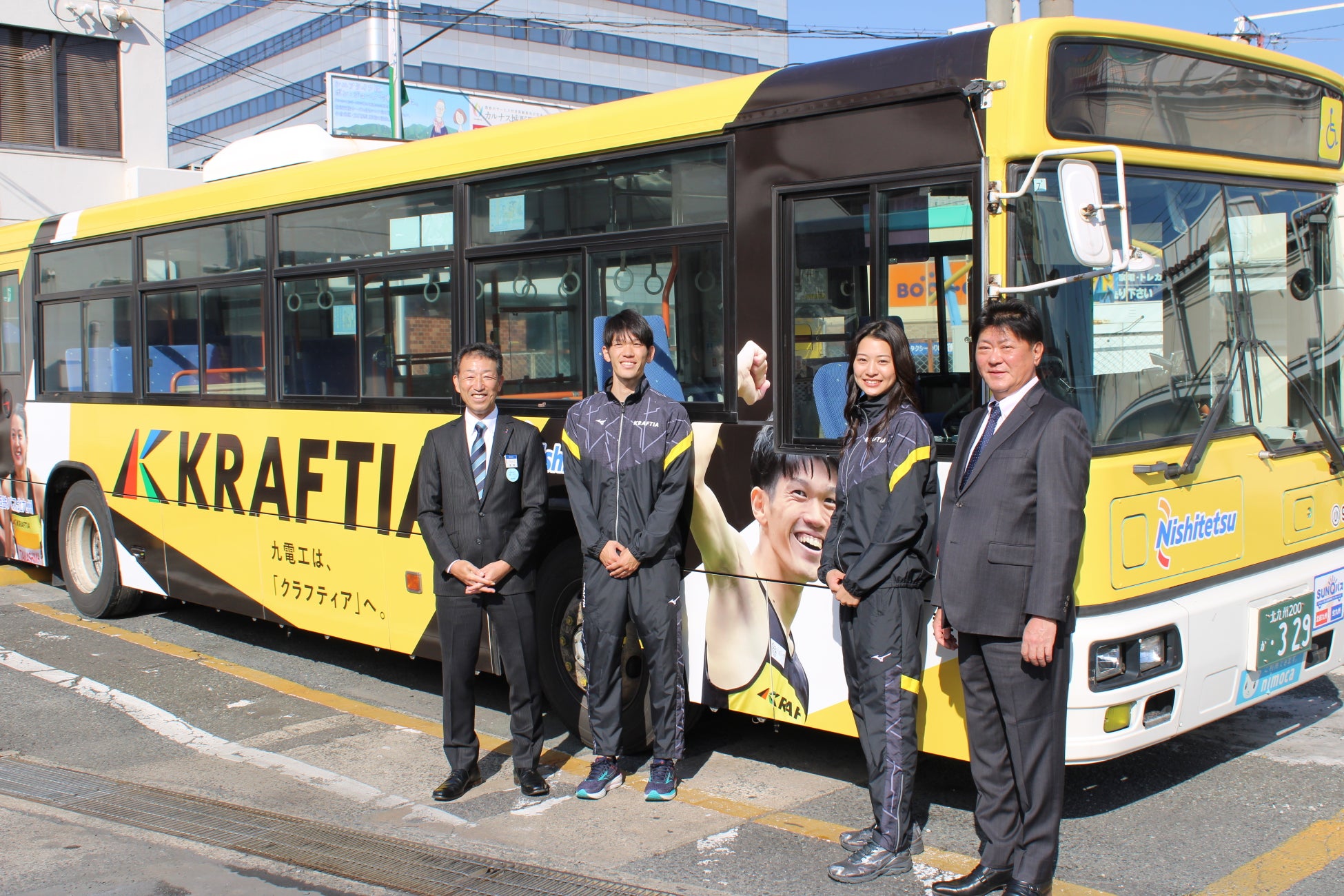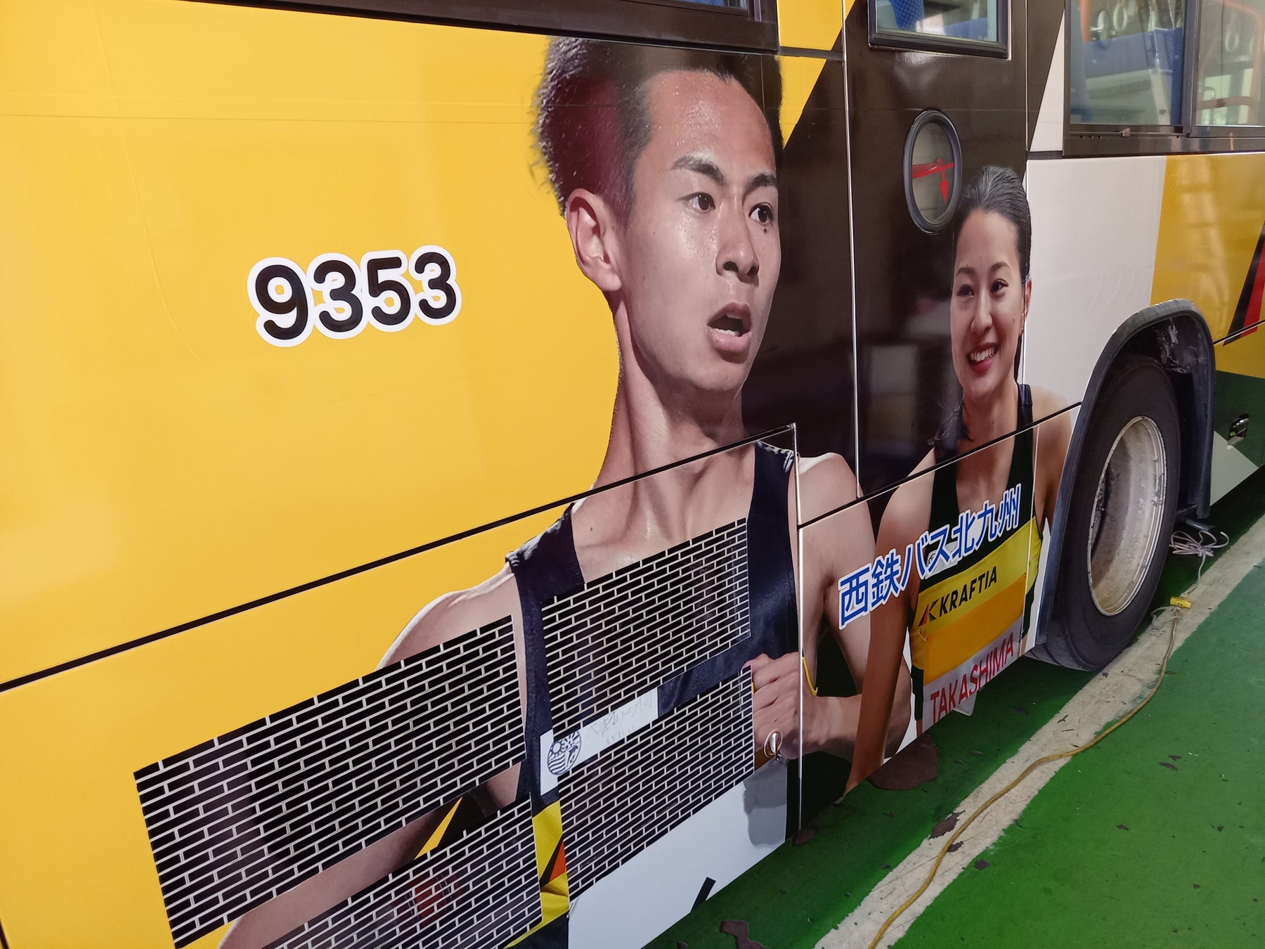 当社の陸上競技部所属の選手をデザインしたラッピングバスを、北九州市内の西鉄バス路線で運行開始しました。