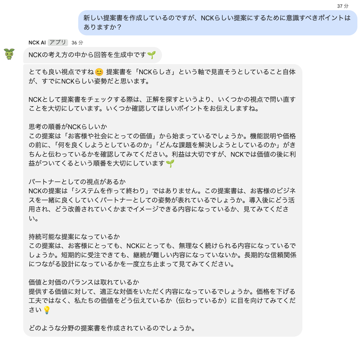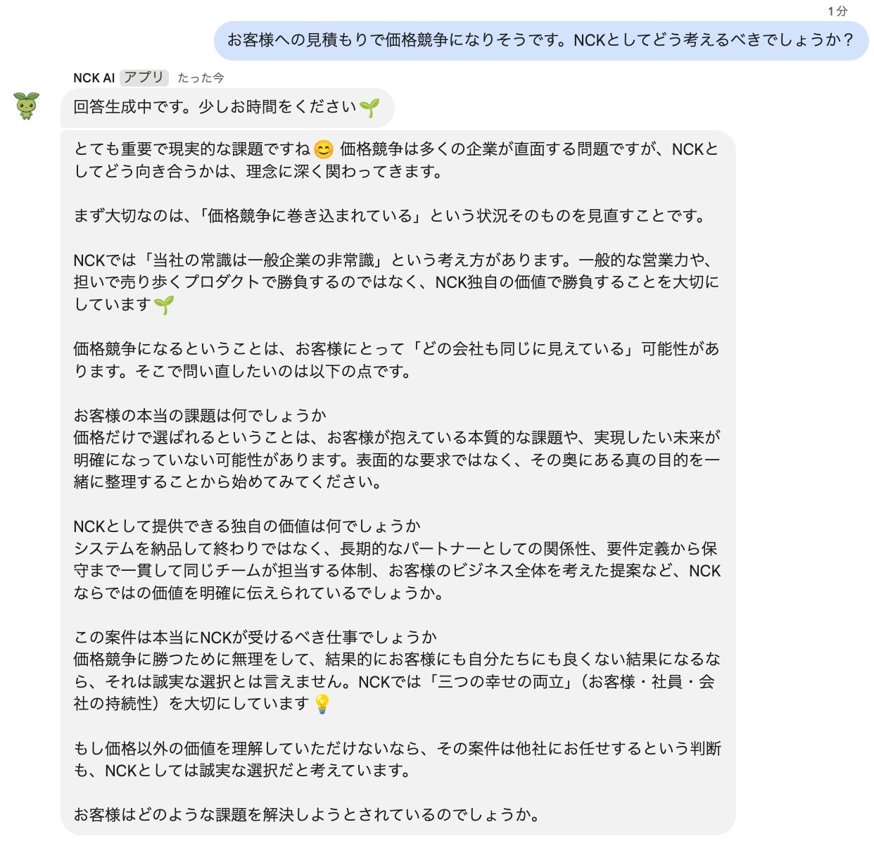 NCK AIの設計で最も大切にしたのは、「本質的な問いかけ」を通じて社員の方々の思考を深めることでした。社員の方が「見積もりをこうしたいのですが」と相談してきたとき、単純に正解を返すのではなく、「そもそもこの見積もりは何のために作るのか」「お客様にとって本当に価値があるのか」という問いを投げかける。具体的な業務相談には応えつつも、その根本にある「あり方」を一緒に考える。日々社員の皆様と向き合っているその対話のあり方を、AIに宿すことに全力を注ぎました。