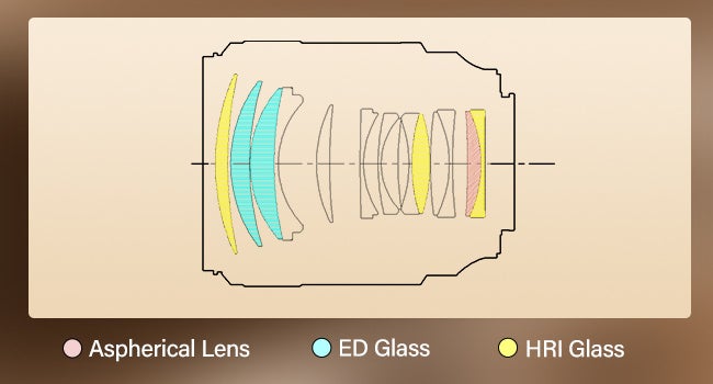 非球面レンズ、ED ガラス、HRI ガラスがレンズサイズを縮小し、同時にフレアとゴーストをうまく制御した優れた光学性能を提供するために追加されました。
