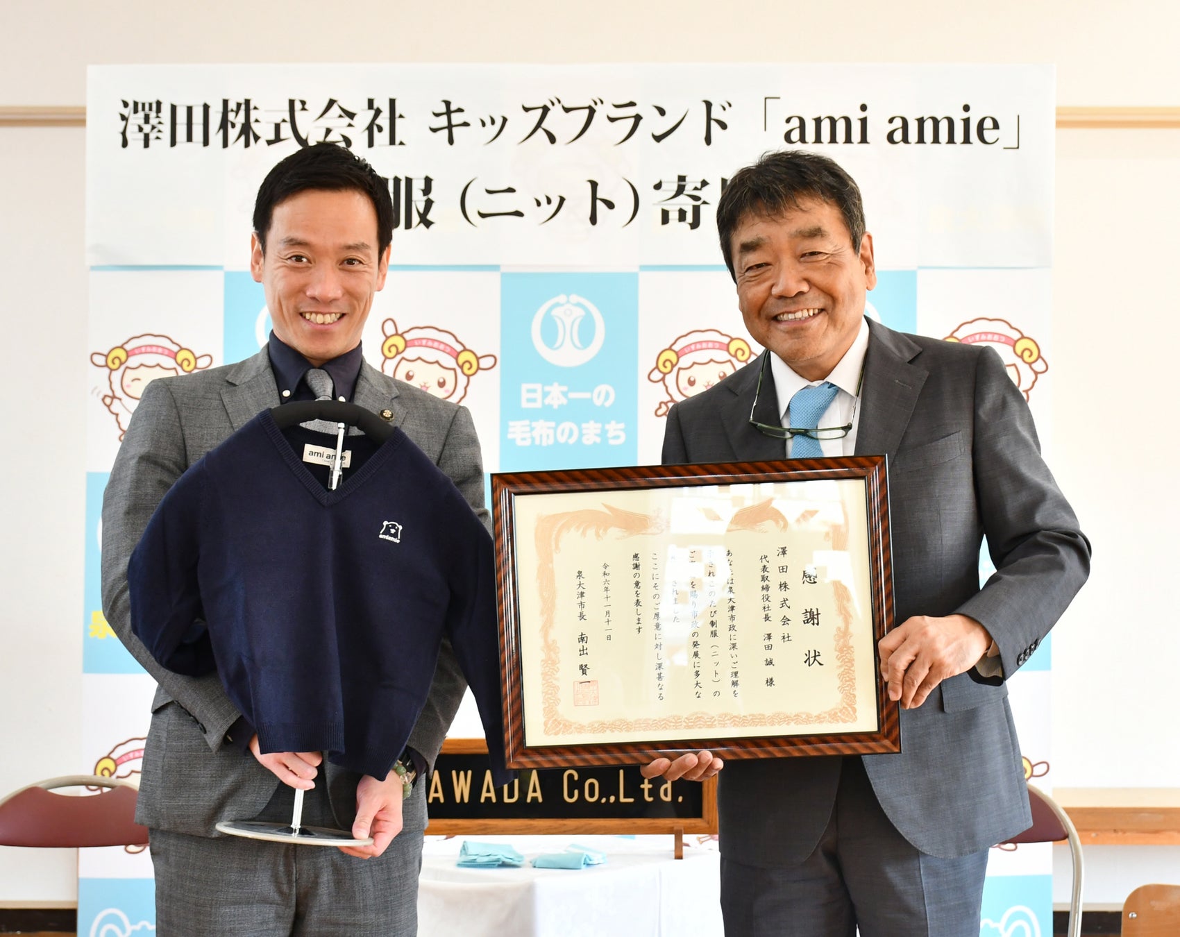 大阪府泉大津市(市長:南出賢一)は、キッズのニット服ブランド「ami amie」を展開するなどニットウェアづくりに強みを持つ澤田株式会社(泉大津市、代表取締役社長:澤田誠)から、子育て支援の充実と、子どもたちの衣環境の向上の一環として、泉大津市立の幼稚園・保育所で着用する制服(ニット)を寄贈いただき、泉大津市で初となる官民連携による制服の共同開発がスタートしました。