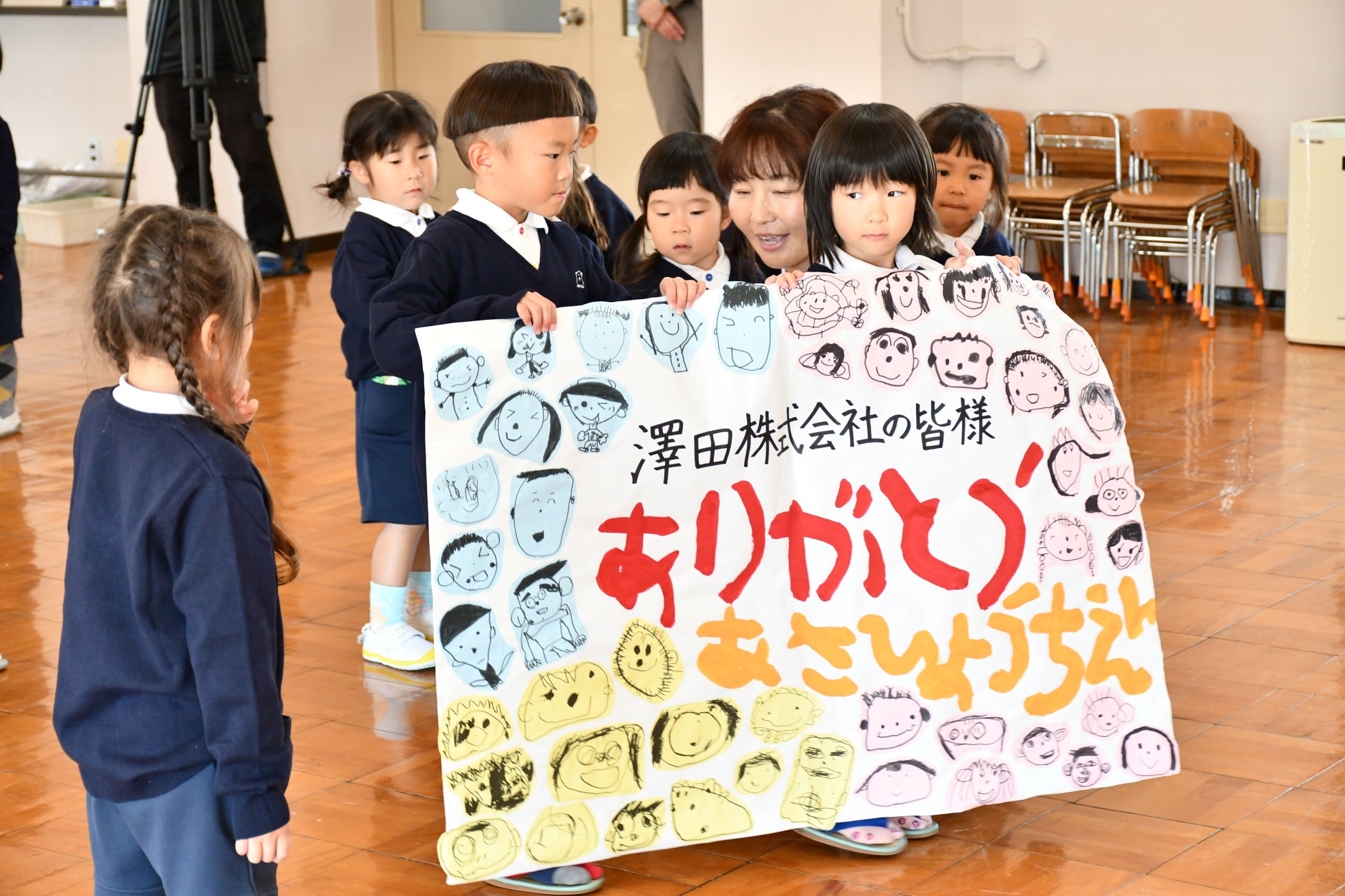 寄贈式では、澤田株式会社から園児へ直接寄贈品が手渡され、園児からは寄贈のお礼としてパフォーマンスの披露やメッセージカードが贈呈されました。