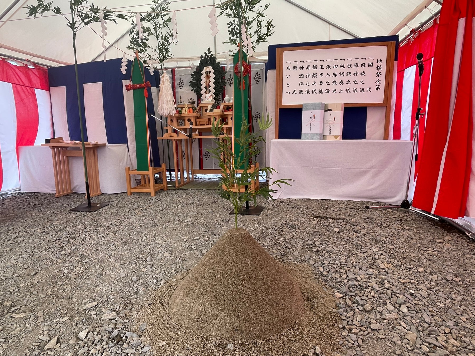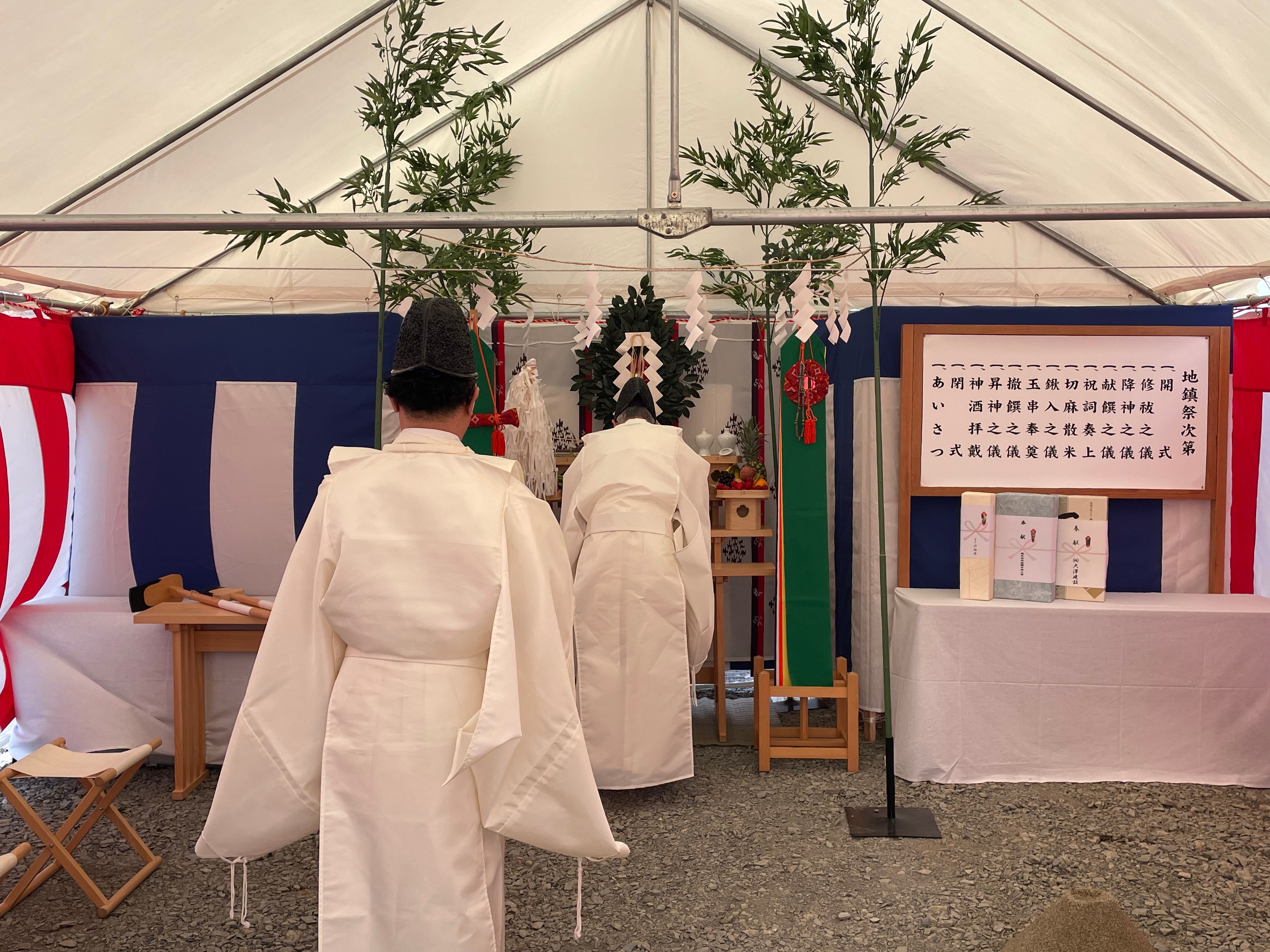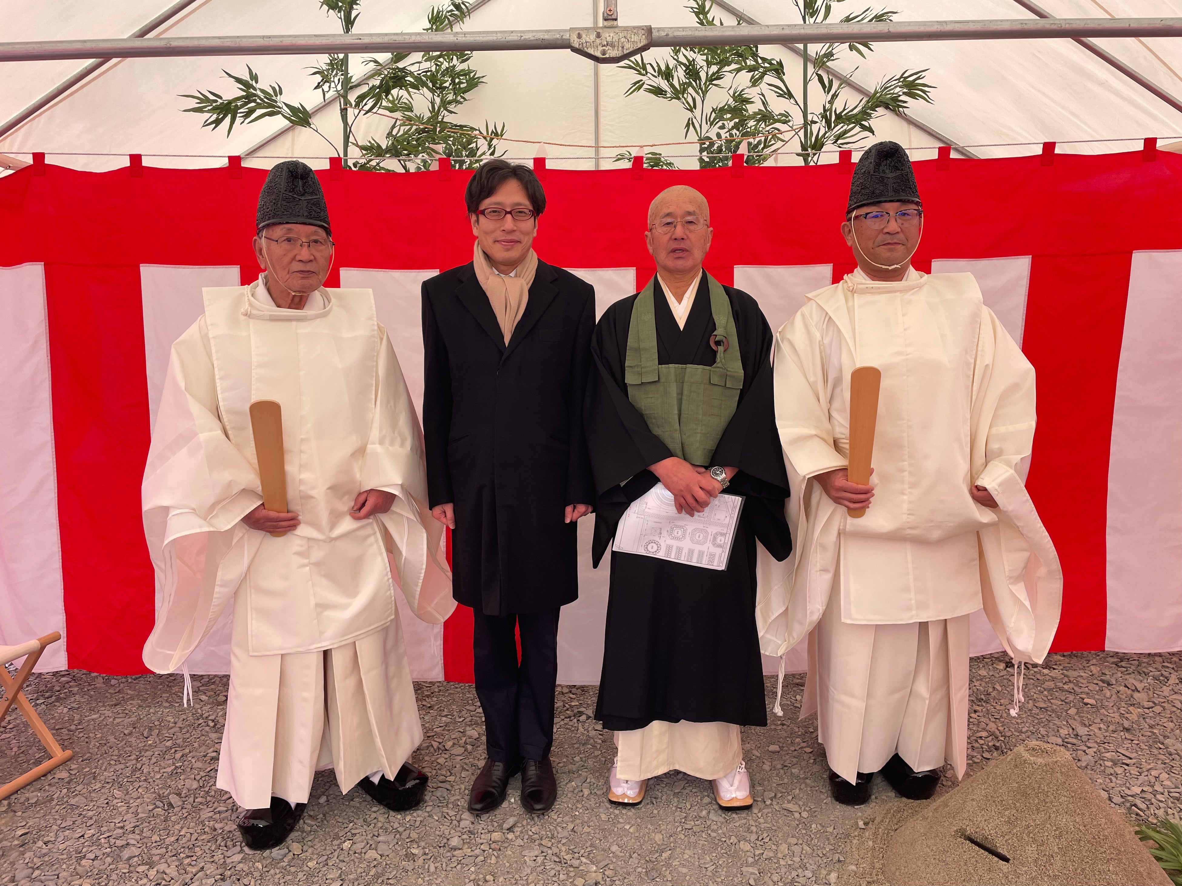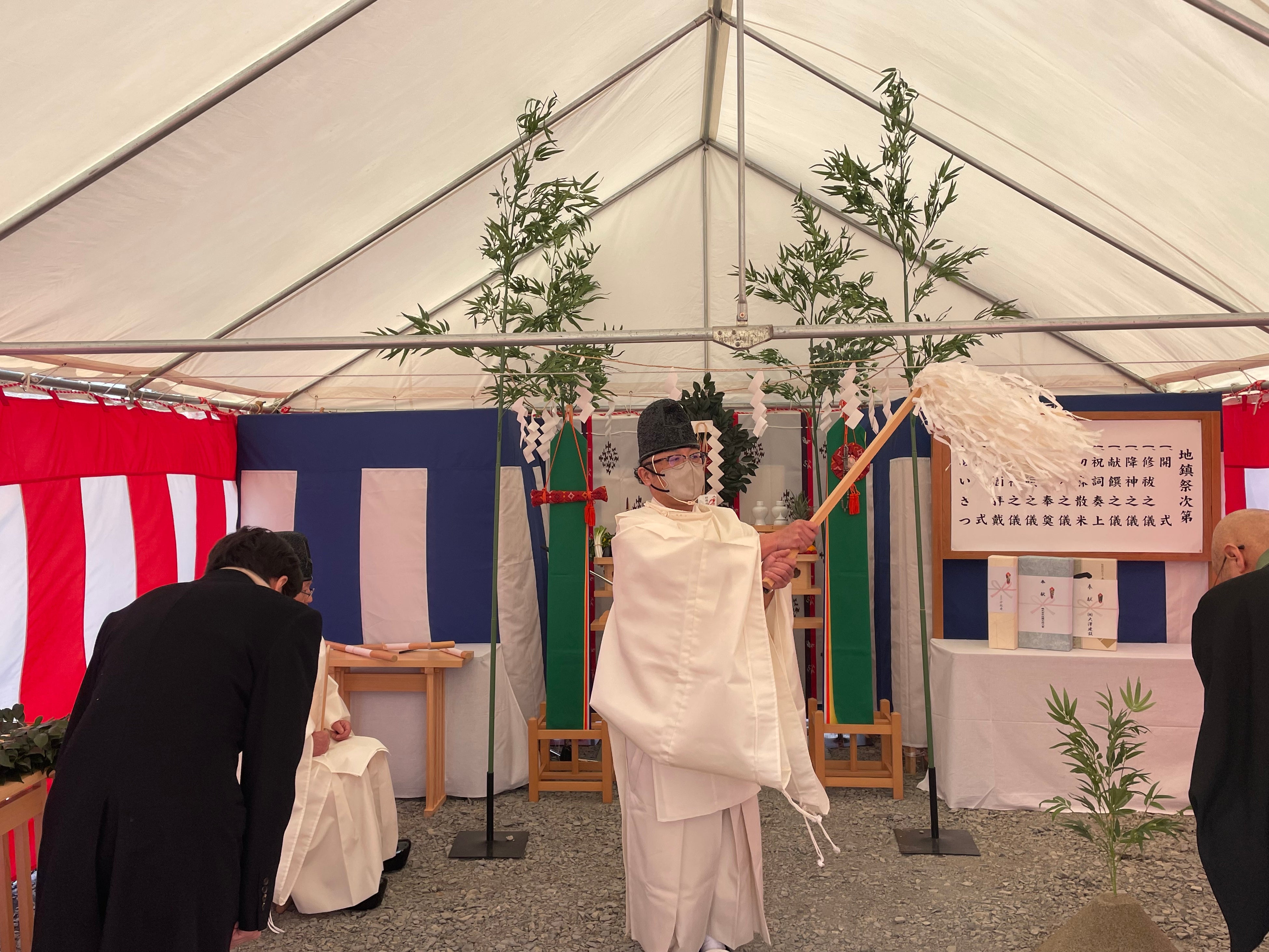 2月には、古墳墓の安全な築造を祈念し、提携神社である大崎八幡神社の神職による地鎮祭を執り行いました。霊園の管理を担う西林寺の住職も参列し、玉串奉奠(たまぐしほうてん)や鍬入れの儀(くわいれのぎ)が行われるなど、神仏習合を象徴する美しい祭祀となりました。