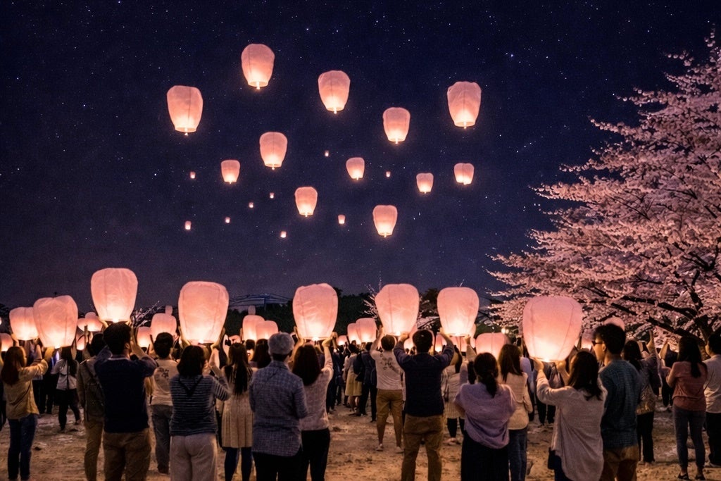 来場者の手元からゆっくりと浮かび上がる無数の光が、会場全体をあたたかく包み込み、桜と光が織りなす特別な春の風景を描き出します。この日、この場所でしか体験できない、心に残るひとときをお楽しみいただけます。