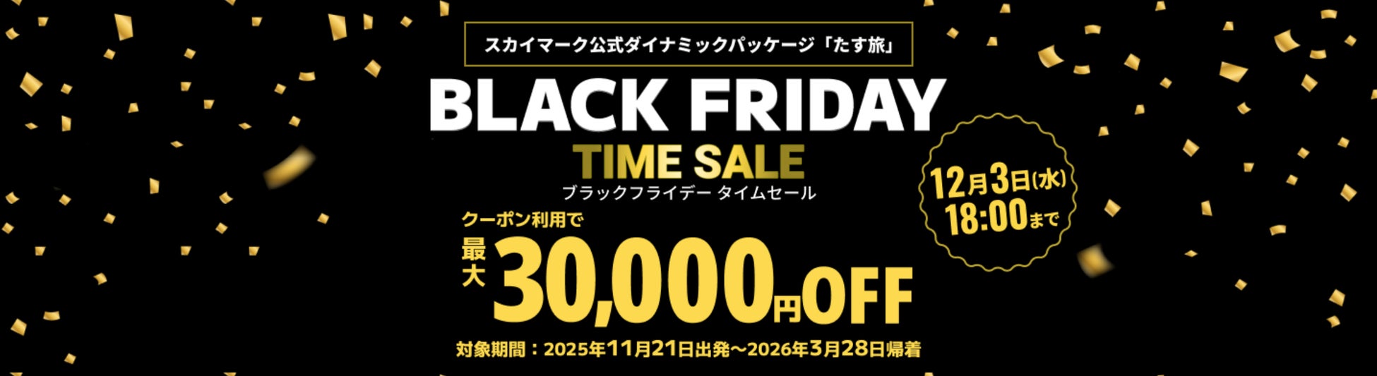 2025年11月21日出発~2026年3月28日帰着分のスカイマーク航空券とホテルがセットになったスカイマーク公式ダイナミックパッケージ『たす旅』でブラックフライデータイムセールの販売を開始しました!