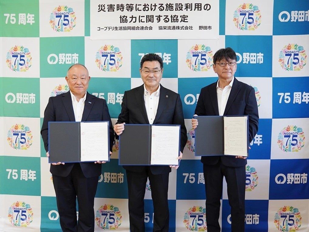 コープデリ生活協同組合連合会(本部:埼玉県さいたま市、代表理事理事長:熊﨑 伸、会員生協:関東信越の6生協、略称:コープデリ連合会)およびコープデリ連合会のグループ会社・協栄流通株式会社(本社:埼玉県所沢市、代表取締役:石井 雅栄)は、千葉県野田市(野田市長:鈴木 有)と「災害時等における施設利用の協力に関する協定」を締結しました。本協定の締結式が10月2日に野田市役所で行われました。