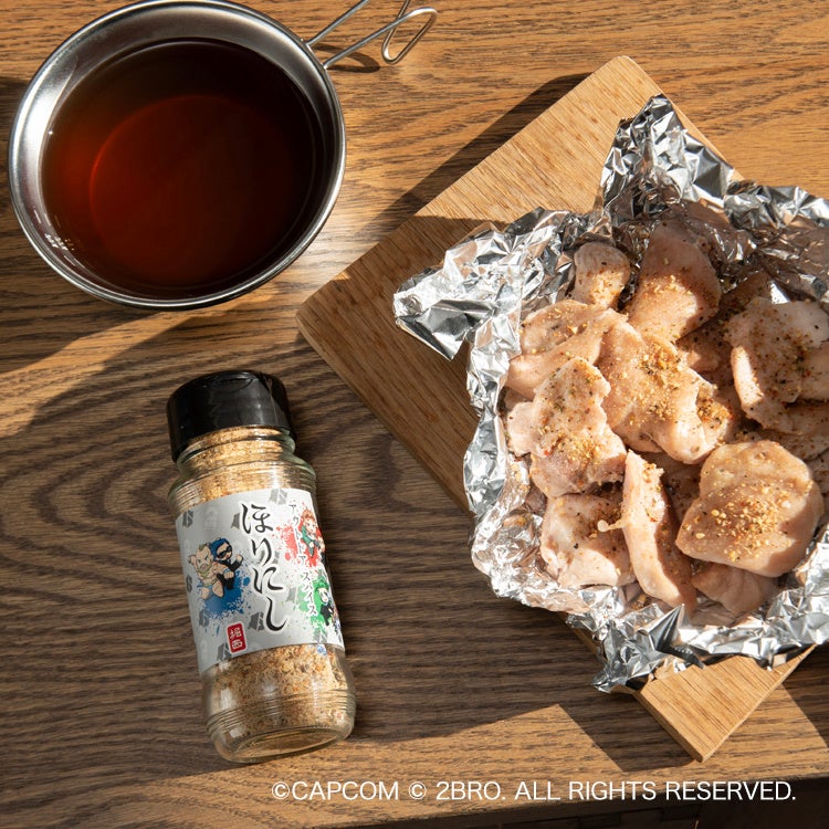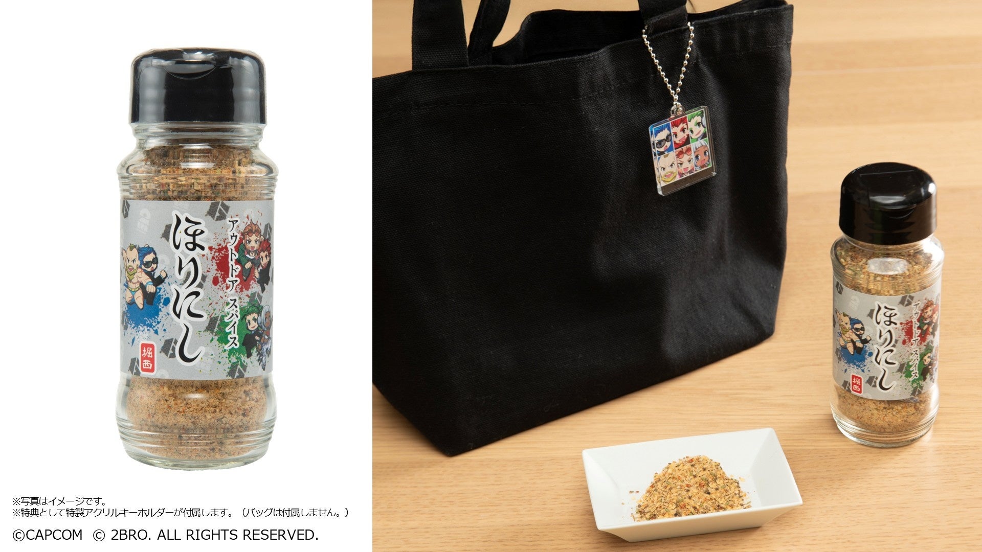 「ほりにし」は和歌山県のアウトドアショップ「Orange」が開発した万能スパイスです。ラベルに描き下ろしアート「兄者×ザンギエフ」「弟者×マリーザ」「おついち×エレナ」のデフォルメver.をあしらいました。