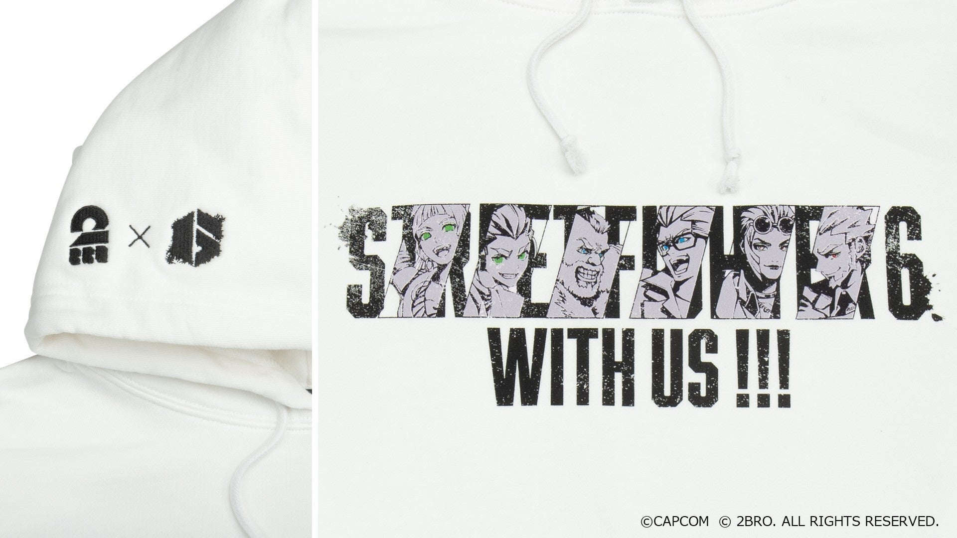 Tシャツ・パーカーのフロントに描き下ろしアートをレイアウト。2BRO.のモットーと「ストリートファイター 6」を掛け合わせた“STREET FIGHTER WITH US”をコンセプトに、登場シーンのようなグラフィティデザインに落とし込みました。兄者・弟者・おついちのイメージカラーを、ザンギエフ・マリーザ・エレナの衣装カラーや瞳にアクセントしてあしらっています。