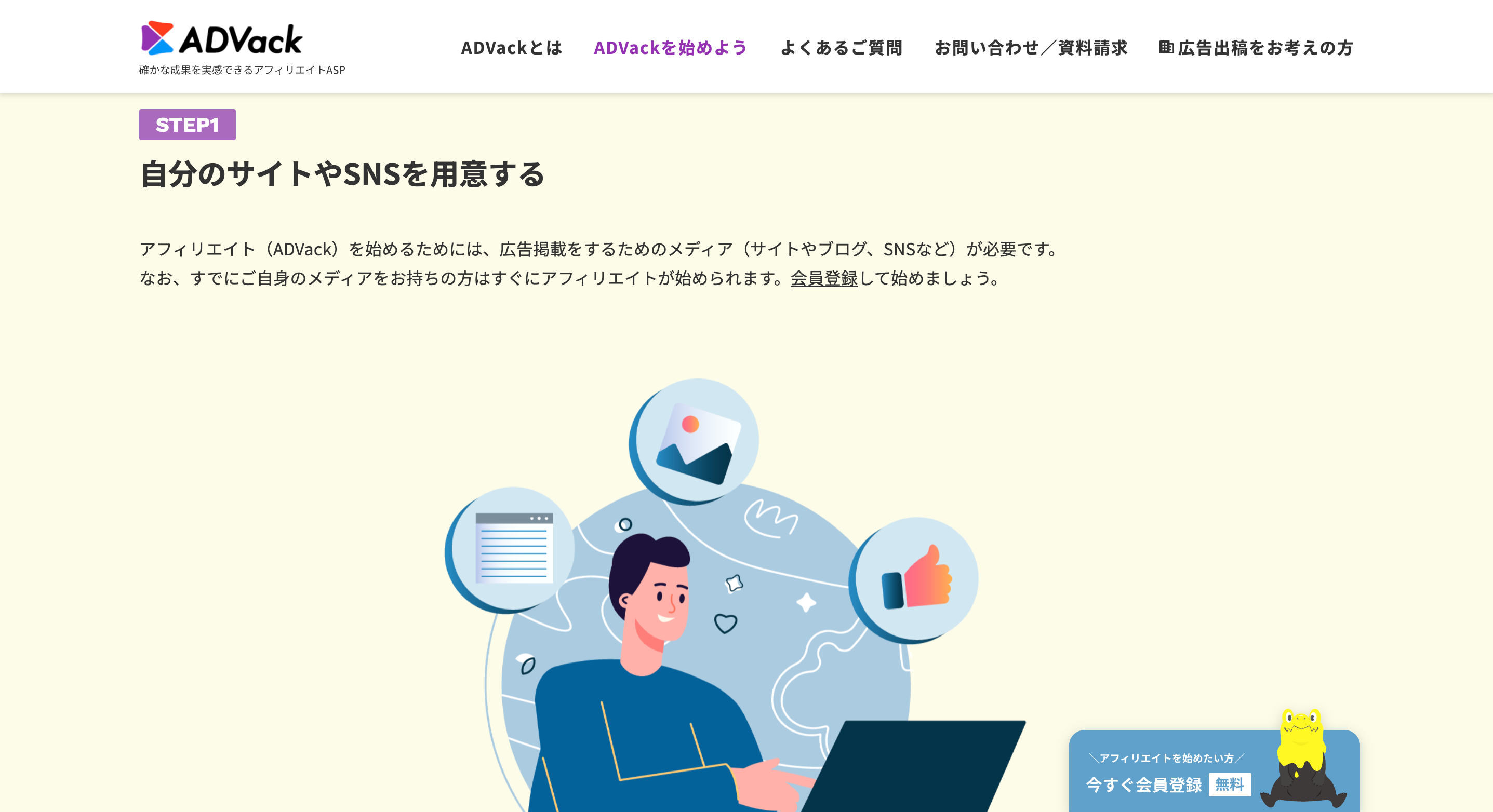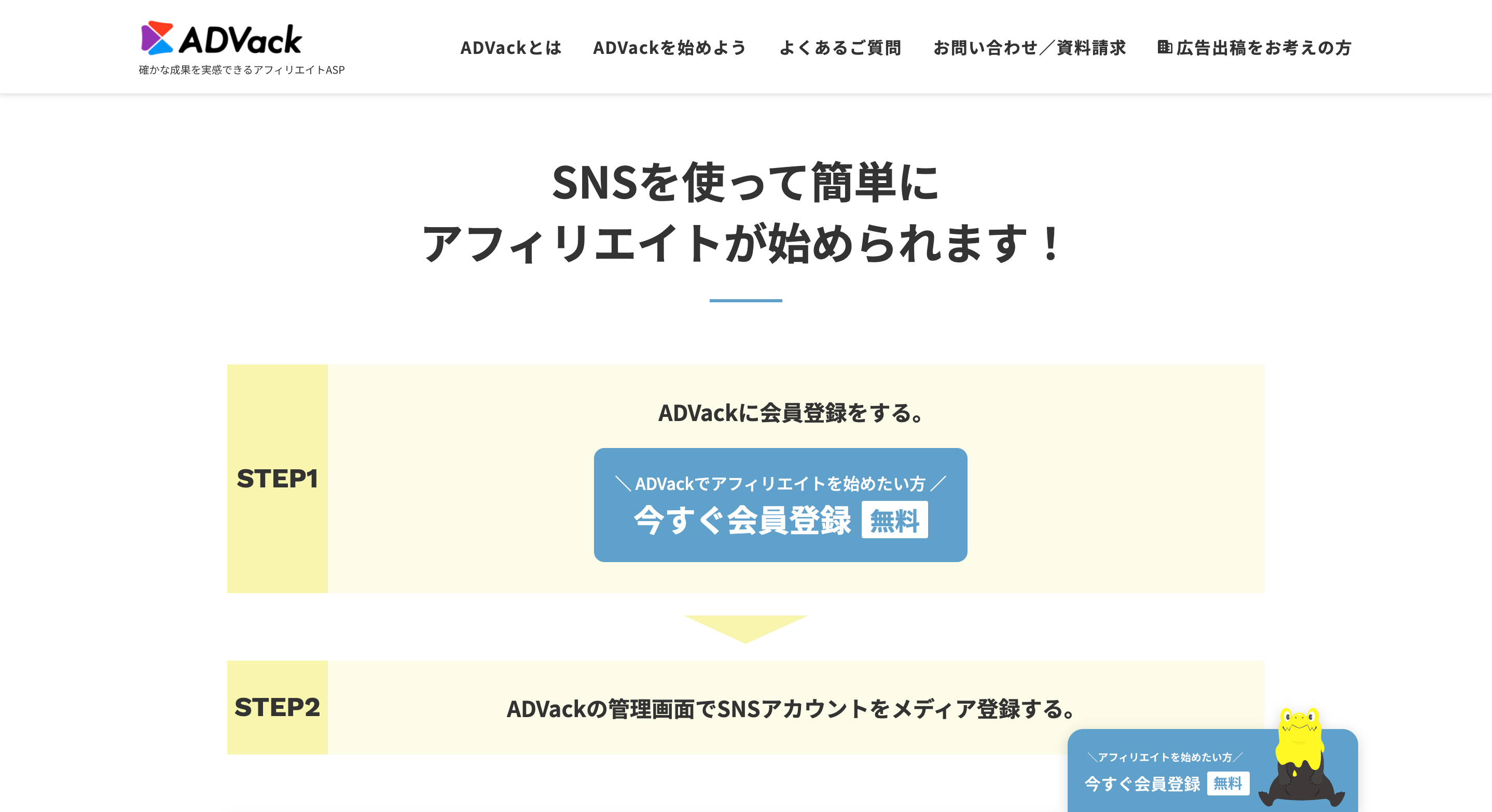 初めてADVackを始める方に向けて、登録の仕方から成果発生までの流れを説明しています。