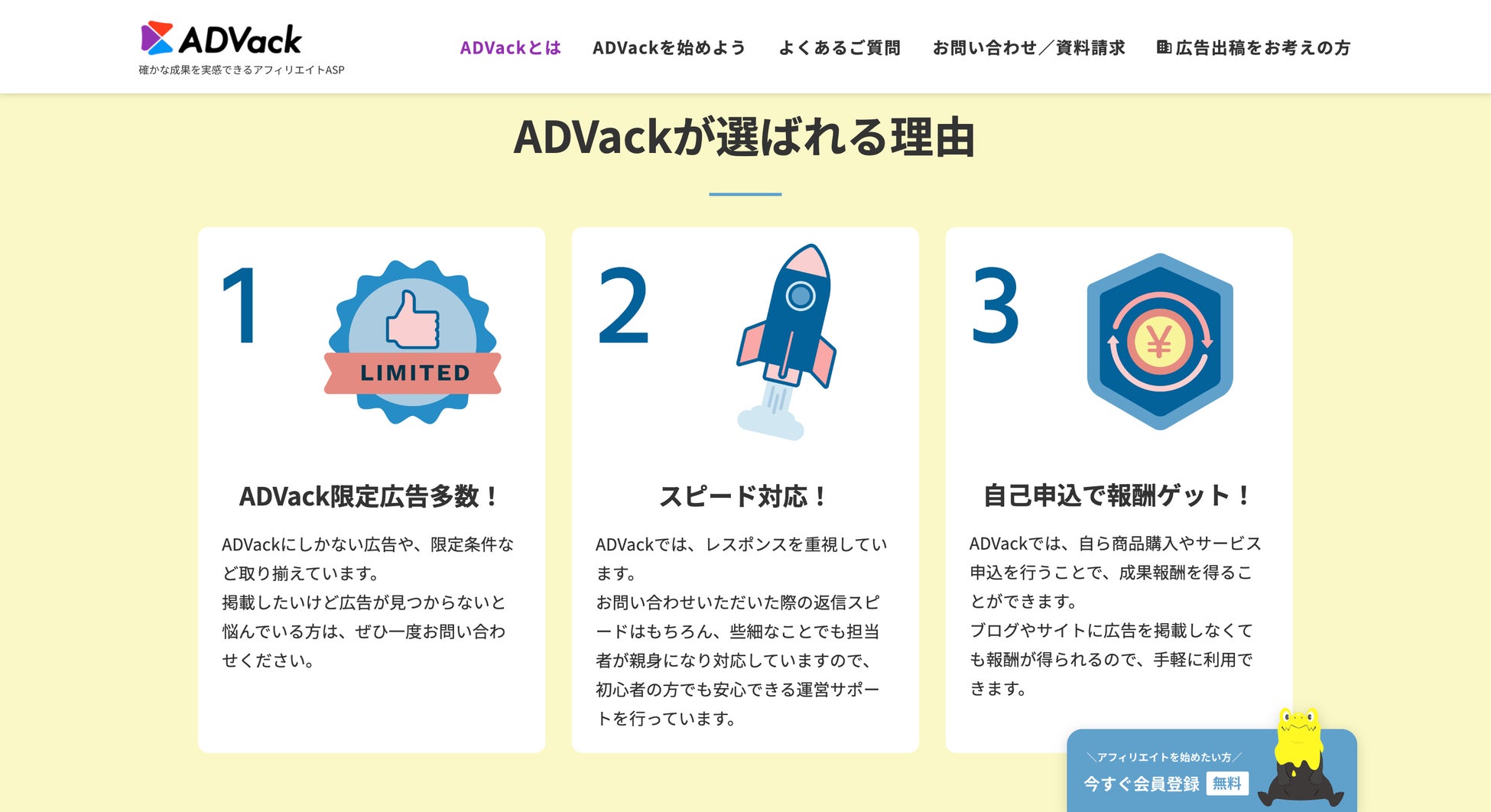 ADVackの特徴はもちろん、そもそもアフィリエイト広告とはどういったものなのかについて、分かりやすくまとめています。
