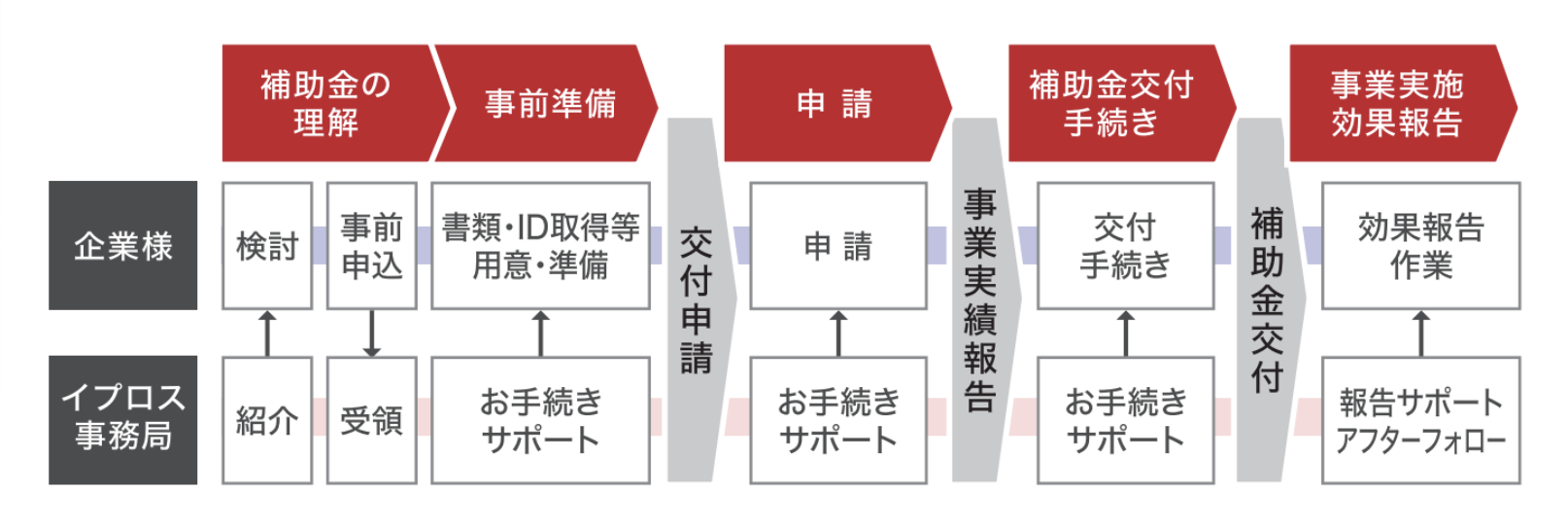Step3:交付決定後交付決定後は以下の手続きを行います。ITツールの発注・契約・支払い事業実績報告事業実施効果報告イプロスIT導入補助金支援事務局が、申請から報告までを一貫してサポートいたします。動画はこちら