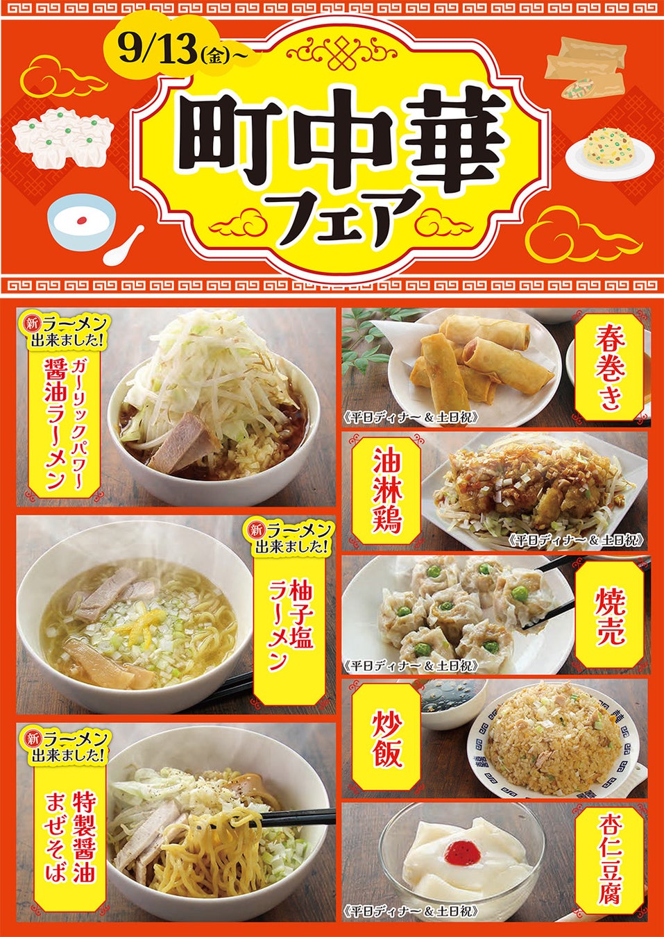 【すたみな太郎】9/13(金)~「町中華フェア!」ニンニクの風味たっぷりガーリックパワー醤油ラーメン、柚子塩ラーメンなど新ラーメンや、春巻き、焼売、油淋鶏他ガッツリ食べ放題!連休にはスペシャル焼肉も!