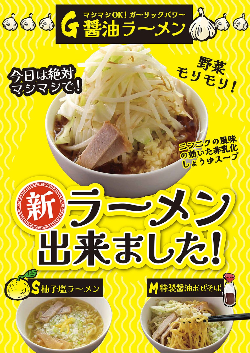 ラーメンコーナーでガーリックパワー醤油ラーメンスープに、麺や野菜を茹でてニンニクやチャーシューをトッピングして完成させます