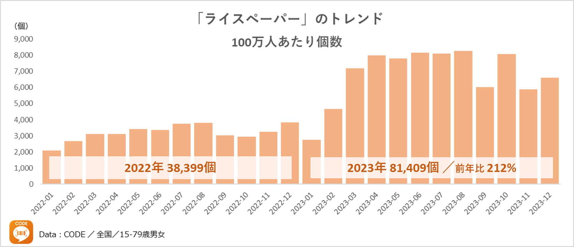 では実際にライスペーパーは売れているのでしょうか?CODEの購買データで購入数のトレンドを確認しました。SNSで話題となり始めたのは昨年の3月頃と言われていますが、購買データでも同じタイミングから購入数が増えていることがわかります。また、瞬間的なものではなく、年間を通して高い購入数を維持していることがわかります。その結果、2023年の購入数は前年比212%と大きく伸長しています。