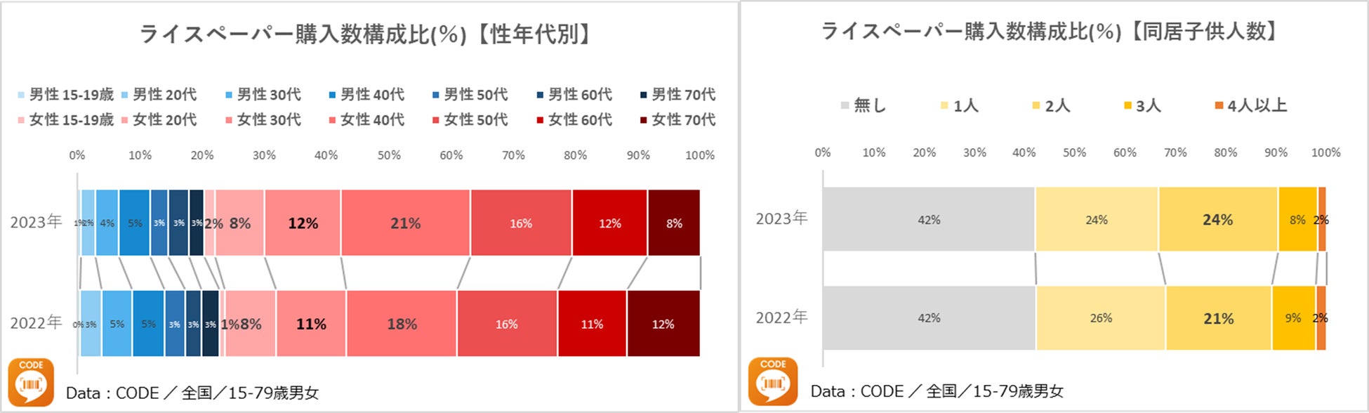 では誰が買うようになったのでしょうか?CODEの購買データから確認してみると、「女性30-40代」、「同居子供人数2人の子育て世代」が多いことがわかりました。尚、購入者の口コミも見ると『TikTokでライスペーパーの料理動画みて、美味しそうだったから、買ってみた!(女性30代)』というようにSNSの影響を受けたこともわかりました。