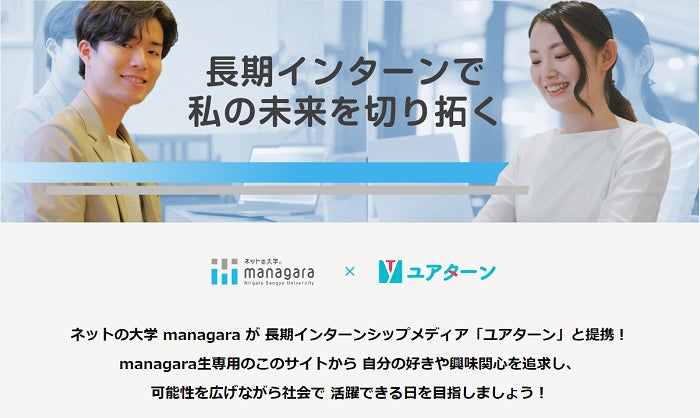この度、ネットの大学 managara(マナガラ)と長期インターンシップ情報サイト「ユアターン」のコラボにより、managara(マナガラ)の学生の進路に役立つキャリア支援を実施いたします。
