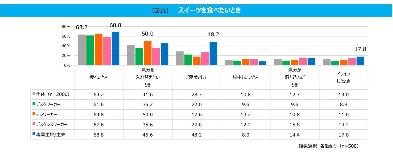 「スイーツを食べたいと感じるとき」を聞くと、全グループで「疲れたとき」が1位に。全体でも63.2%が回答し、スイーツで疲れを癒す人が多いことがうかがえる結果となりました。2位は「気分を入れ替えたいとき」が多く、 「テレワーカー」(50.0%)を筆頭に、「デスクワーカー」「デスクレスワーカー」でリフレッシュしたいときにスイーツの力を借りるという人も多いようです。