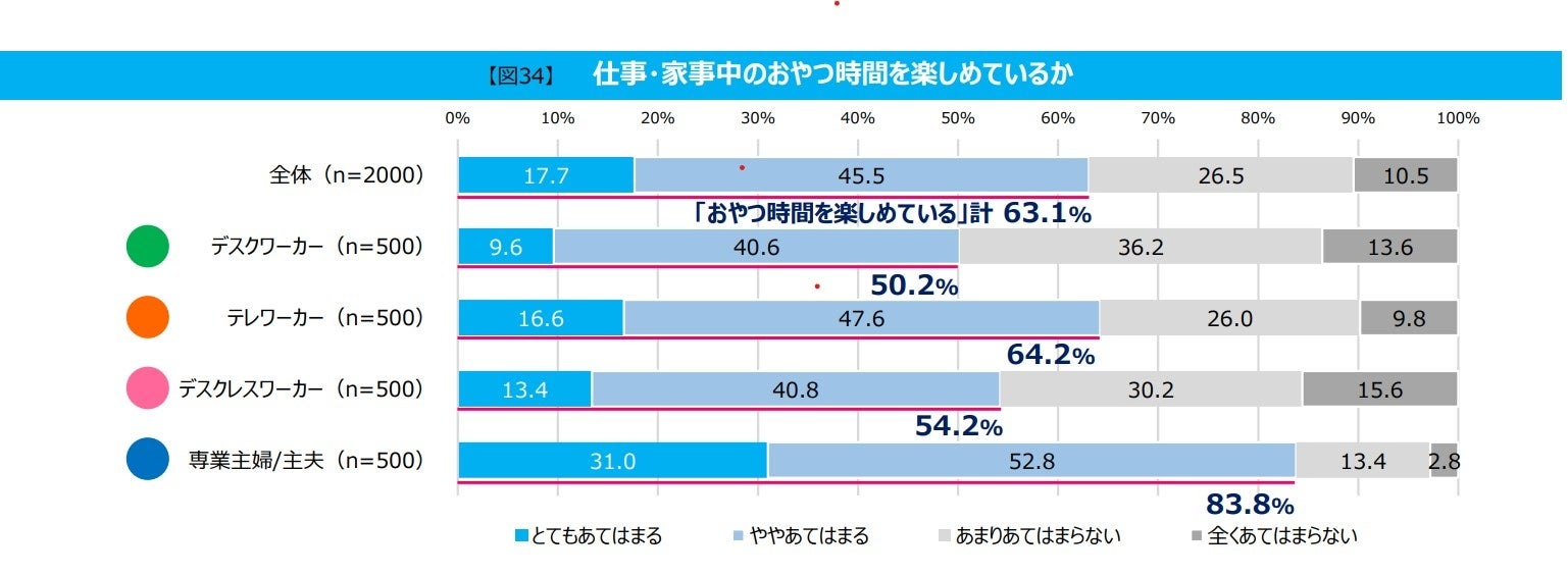 その一方で、「おやつ時間を楽しめているか」では「デスクレスワーカー」(54.2%)、「デスクワーカー」(50.2%)は半数という結果に。