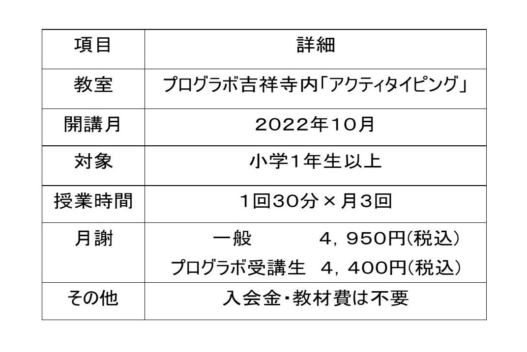 体験をご希望の方はプログラボHPより教室選択欄で「東京都―吉祥寺(アクティタイピング)」を選択のうえ、ご希望の日程を選択してご応募下さい。 (http://www.proglab.education/)