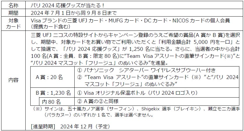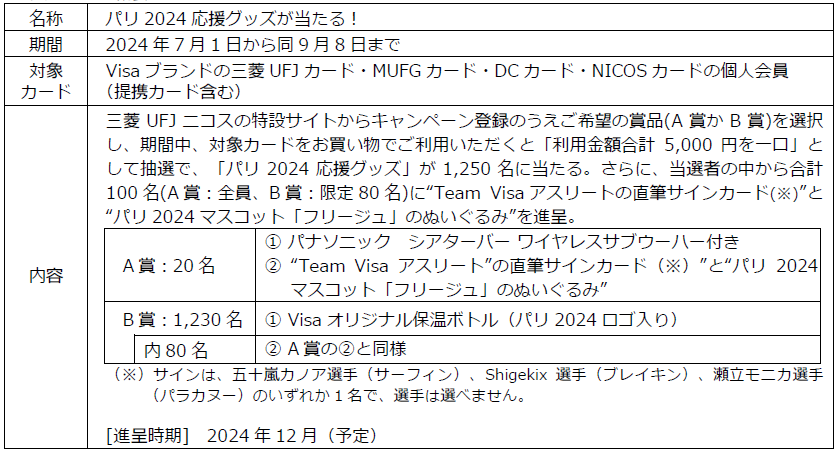 ビザ・ワールドワイド・ジャパン株式会社(本社:東京都千代田区、代表取締役社長:シータン・キトニー、以下「Visa」)と三菱UFJニコス株式会社(本社:東京都千代田区、代表取締役社長:角田典彦、以下「三菱UFJニコス」)は7月1日から9月8日まで、Visaブランドの三菱UFJカード・MUFGカード・DCカード・NICOSカードの個人会員(提携カードを含む)向けに、合計5,000円以上のご利用により、パリ2024オリンピック・パラリンピック(以下、パリ2024)応援グッズが1,250名に当たるキャンペーンを実施しています。
