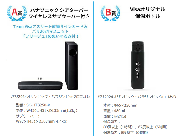 本キャンペーンは、期間中の対象カードの合計利用金額5,000円を一口として、抽選でホームシアター用スピーカー「パナソニック シアターバー ワイヤレスウーハー付き」(A賞)を20名に、パリ2024ロゴ入りの「Visaオリジナル保温ボトル」(B賞)を1,230名にそれぞれ進呈する企画です。また、当選者の中から合計100名(A賞:全員、B賞:限定80名)に「Team Visaアスリート」の直筆サインカード(※詳細は下表参照)とパリ2024マスコット「フリージュ」のぬいぐるみをプレゼントします。本キャンペーンにより、今夏の同祭典を一層盛り上げていきたいと考えているものです。