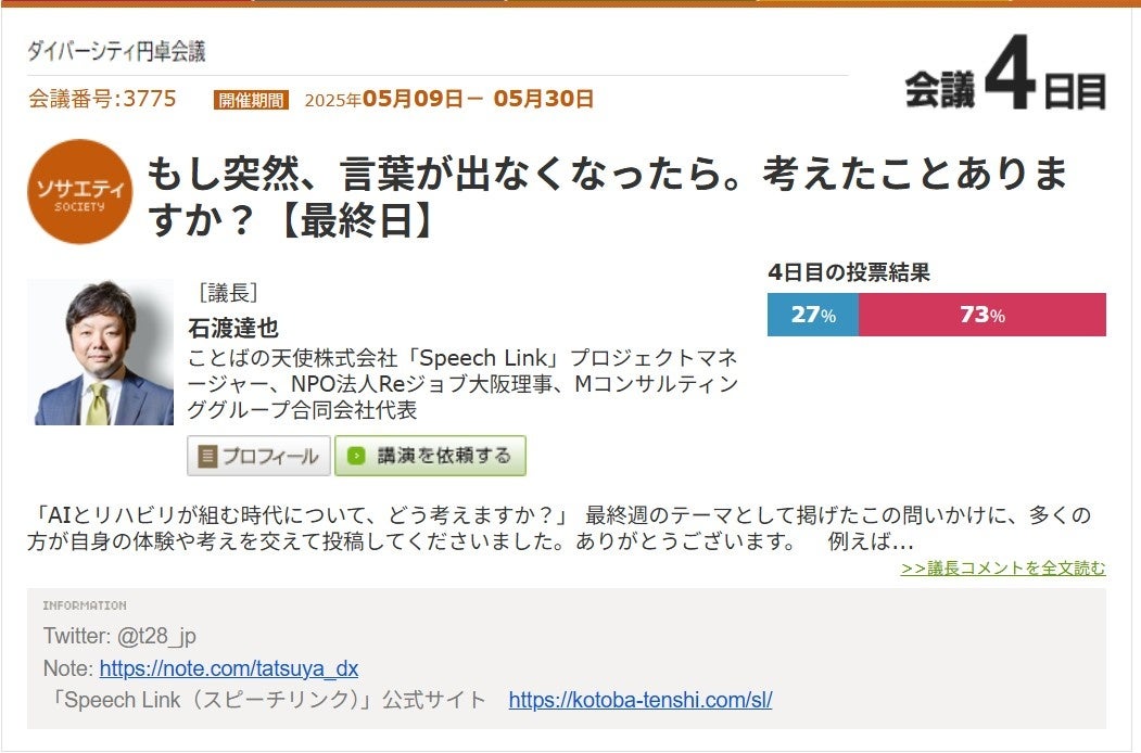 働く人の多様な視点が集まる「ダイバーシティ円卓会議」。No.3775の会議テーマは、「もし突然、言葉が出なくなったら。考えたことありますか?」。議長に、言語リハビリアプリの開発を進める石渡達也氏(ことばの天使株式会社「Speech Link」プロジェクトマネージャー他)を迎え、2025年5月9日(金)から30日(金)まで、4回にわたり議論を行いました。