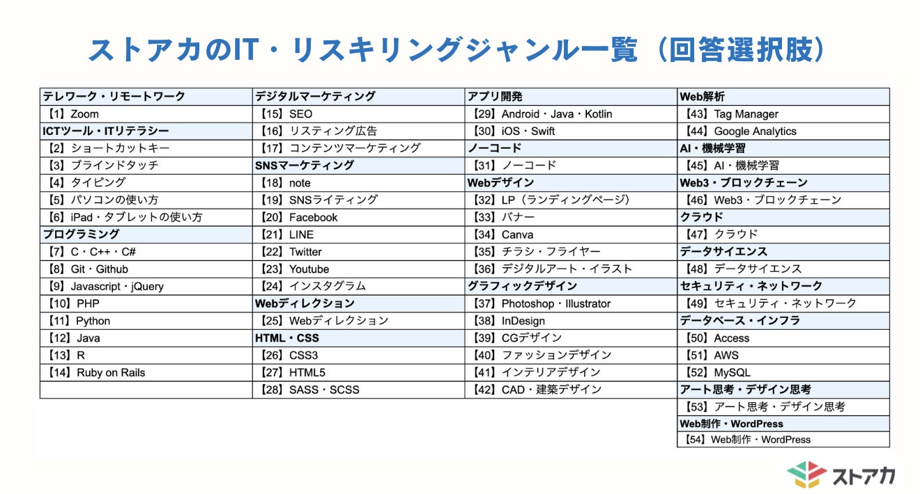 リスキングしたいスキルの回答選択肢:ストアカのIT・リスキリングジャンル(本文下部掲載)