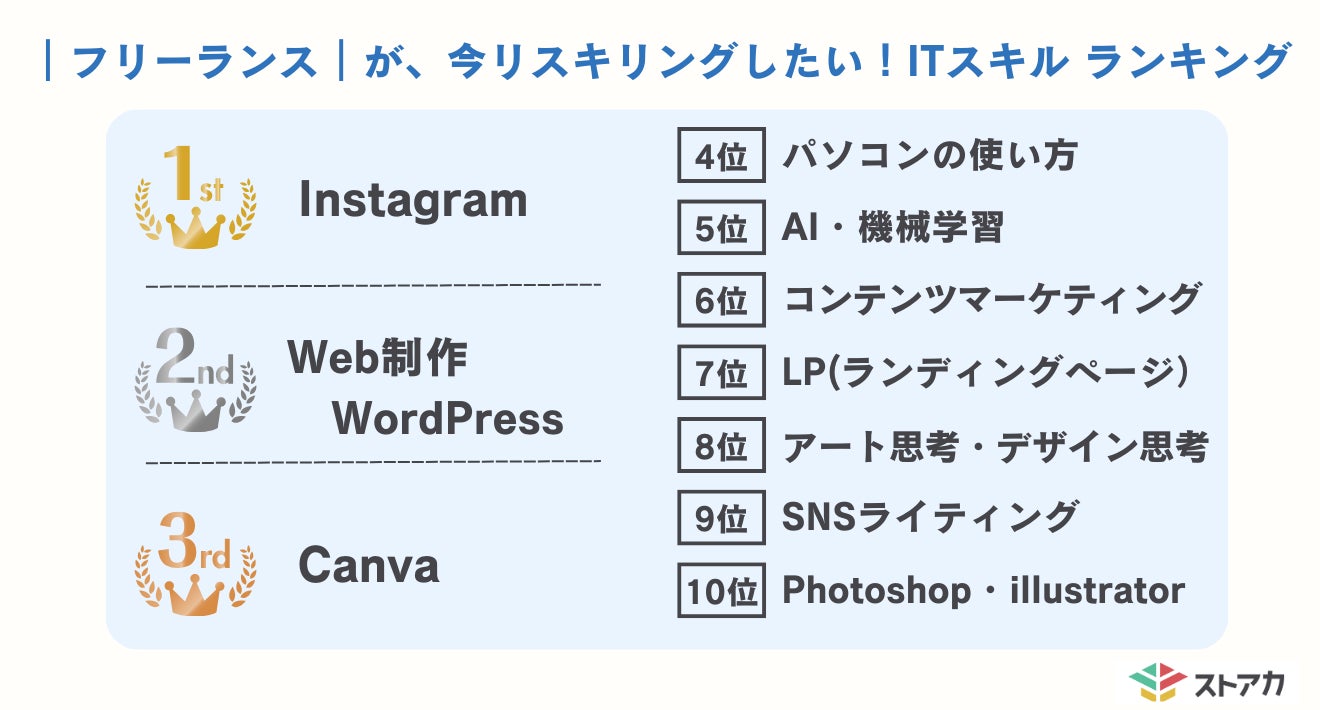 フリーランスがリスキリングしたいスキル第1位「Instagram」、第2位「Web制作・WordPress」学びたい理由は新しい仕事の獲得に繋がるから