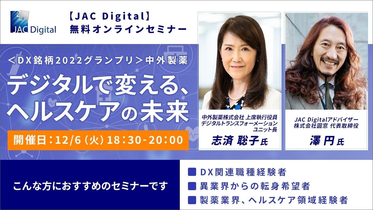 日本IBMから転身し、中外製薬のデジタルトランスフォーメーションユニットをリードする志済 聡子氏に登壇いただき、元日本マイクロソフト業務執行役員でJAC Digitalアドバイザーである澤 円氏が質問者となって、異業界人財の活躍を紹介しつつ、AI創薬や研究開発におけるデジタル戦略のイノベーション事例を交えながら、「ヘルスケアの未来」に迫ります。