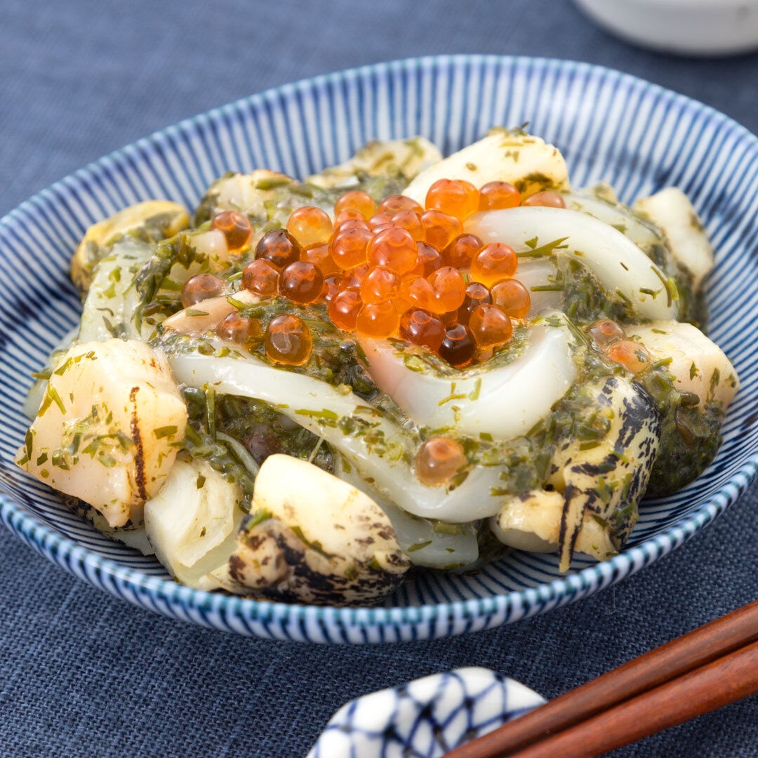 三陸漁師の家庭に伝わるウニ水の調味料「かぜ水」で味付け、様々な食感と味を楽しめます。
