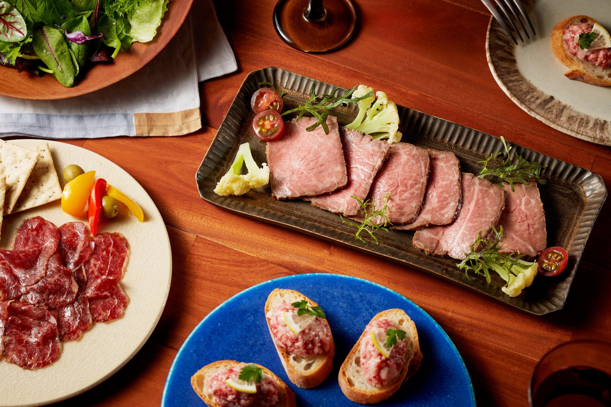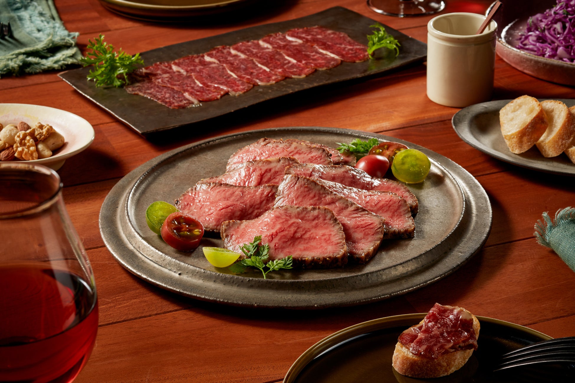 パーティー利用で人気が高いUCHIGOROのゴールデンコンビ、ローストビーフ(ザブトン)と生ハムを、大人数でシェアできる内容量とリーズナブルな価格で提供いたします。