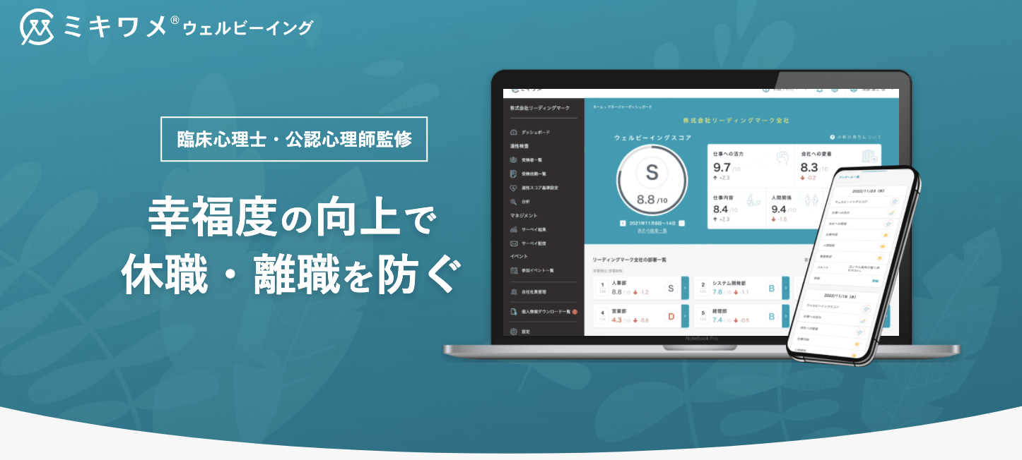 -社員のメンタル状態を可視化し、性格をもとにアドバイスをすることでウェルビーイングを実現「ミキワメ ウェルビーイング」https://mikiwame.com/well-being.html?data=pr