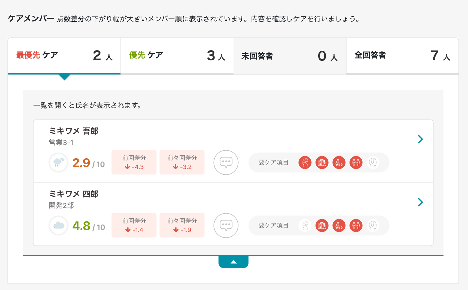 今回のアップデートにより、管理画面でケアが必要な社員に表示される「最優先ケア」「優先ケア」の条件を変更しています。従来よりも適切なフォローを実施いただけるようにアップデートいたしました。