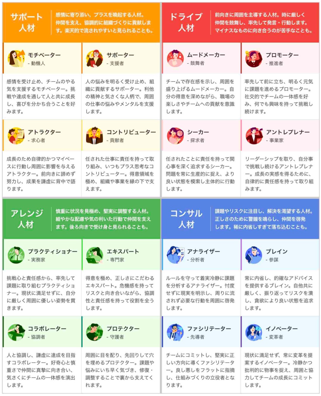 「ミキワメ 適性検査」の検査では、現在、上記のように16の性格タイプが存在します。